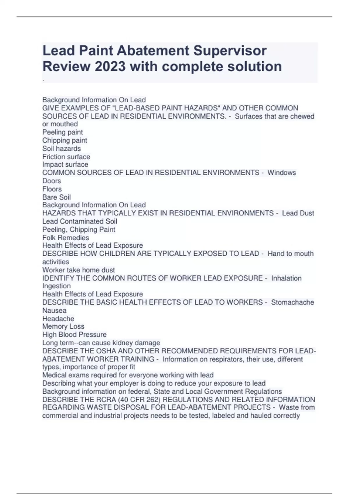 Lead Paint Abatement Supervisor Review 2023 with complete solution . Background Information On Lead GIVE EXAMPLES OF "LEAD-BASED PAINT HAZARDS" AND OTHER COMMON SOURCES OF LEAD IN RESIDENTIAL ENVIRONMENTS. - Surfaces that are chewed or mouthed Peeling paint Chipping paint Soil hazards Friction surface Impact surface COMMON SOURCES OF LEAD IN RESIDENTIAL ENVIRONMENTS - Windows Doors Floors Bare Soil Background Information On Lead HAZARDS THAT TYPICALLY EXIST IN RESIDENTIAL ENVIRONMENTS - Lead Dust Lead Contaminated Soil Peeling, Chipping Paint Folk Remedies Health Effects of Lead Exposure DESCRIBE HOW CHILDREN ARE TYPICALLY EXPOSED TO LEAD - Hand to mouth activities Worker take home dust IDENTIFY THE COMMON ROUTES OF WORKER LEAD EXPOSURE - Inhalation Ingestion Health Effects of Lead Exposure DESCRIBE THE BASIC HEALTH EFFECTS OF LEAD TO WORKERS - Stomachache Nausea Headache Memory Loss High Blood Pressure Long term--can cause kidney damage DESCRIBE THE OSHA AND OTHER RECOMMENDED REQUIREMENTS FOR LEAD-ABATEMENT WORKER TRAINING - Information on respirators, their use, different types, importance of proper fit Medical exams required for everyone working with lead Describing what your employer is doing to reduce your exposure to lead Background information on federal, State and Local Government Regulations DESCRIBE THE RCRA (40 CFR 262) REGULATIONS AND RELATED INFORMATION REGARDING WASTE DISPOSAL FOR LEAD-ABATEMENT PROJECTS - Waste from commercial and industrial projects needs to be tested, labeled and hauled correctly Waste from residential property will most likely fall under the household hazardous waste exemption . Background information on federal, State and Local Government Regulations IDENTIFY THE LEAD RCRA DEFINITIONS OF HAZARDOUS WASTE AND TESTING PROCEDURES - TCLP test - Toxicity Characteristic Leaching Procedure Detects how much lead would leach out of the waste. 5 mg/l is considered hazardous waste Lead meets the toxicity part of