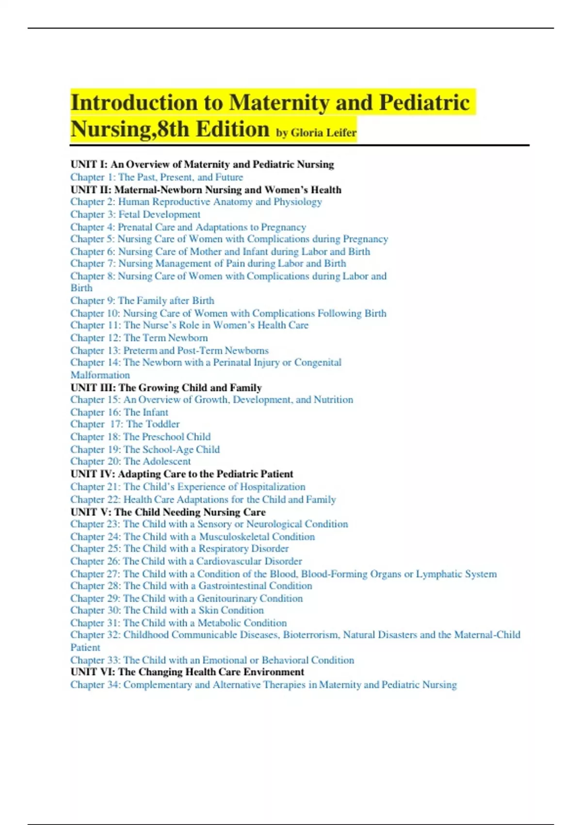 Introduction to Maternity and Pediatric Nursing, 8th Edition by Gloria Leifer UNIT I: An Overview of Maternity and Pediatric Nursing Chapter 1: The Past, Present, and Future UNIT II: Maternal-Newborn Nursing and Women’s Health Chapter 2: Human Reproductive Anatomy and Physiology Chapter 3: Fetal Development Chapter 4: Prenatal Care and Adaptations to Pregnancy Chapter 5: Nursing Care of Women with Complications during Pregnancy Chapter 6: Nursing Care of Mother and Infant during Labor and Birth Chapter 7: Nursing Management of Pain during Labor and Birth Chapter 8: Nursing Care of Women with Complications during Labor and Birth Chapter 9: The Family after Birth Chapter 10: Nursing Care of Women with Complications Following Birth Chapter 11: The Nurse’s Role in Women’s Health Care Chapter 12: The Term Newborn Chapter 13: Preterm and Post-Term Newborns Chapter 14: The Newborn with a Perinatal Injury or Congenital Malformation UNIT III: The Growing Child and Family Chapter 15: An Overview of Growth, Development, and Nutrition Chapter 16: The Infant Chapter 17: The Toddler Chapter 18: The Preschool Child Chapter 19: The School-Age Child Chapter 20: The Adolescent UNIT IV: Adapting Care to the Pediatric Patient Chapter 21: The Child’s Experience of Hospitalization Chapter 22: Health Care Adaptations for the Child and Family UNIT V: The Child Needing Nursing Care Chapter 23: The Child with a Sensory or Neurological Condition Chapter 24: The Child with a Musculoskeletal Condition Chapter 25: The Child with a Respiratory Disorder Chapter 26: The Child with a Cardiovascular Disorder Chapter 27: The Child with a Condition of the Blood, Blood-Forming Organs or Lymphatic System Chapter 28: The Child with a Gastrointestinal Condition Chapter 29: The Child with a Genitourinary Condition Chapter 30: The Child with a Skin Condition Chapter 31: The Child with a Metabolic Condition Chapter 32: Childhood Communicable Diseases, Bioterrorism, Natural Disasters and the Maternal-Child Patient Chapter 33: The Child with an Emotional or Behavioral Condition UNIT VI: The Changing Health Care Environment Chapter 34: Complementary and Alternative Therapies in Maternity and Pediatric Nursing Chapter 01: The Past, Present, and Future MULTIPLE CHOICE 1. A patient chooses to have the certified nurse midwife (CNM) provide care during her pregnancy. What does the CNMs scope of practice include? a. Practice independent from medical supervision b. Comprehensive prenatal care c. Attendance at all deliveries d. Cesarean sections ANS: B The CNM provides comprehensive prenatal and postnatal care, attends uncomplicated deliveries, and ensures that a backup physician is available in case of unforeseen problems. DIF: Cognitive Level: Comprehension REF: Page 6 TOP: Advance Practice Nursing Roles KEY: Nursing Process Step: Implementation MSC: NCLEX: Health Promotion and Maintenance: Prevention and Early Detection of Disease 2. Which medical pioneer discovered the relationship between the incidence of puerperal fever and unwashed hands? a. Karl Cred b. Ignaz Semmelweis c. Louis Pasteur d. Joseph Lister ANS: B Ignaz Semmelweis deduced that puerperal fever was septic, contagious, and transmitted by the unwashed hands of physicians and medical students. DIF: Cognitive Level: Knowledge REF: Page 2 TOP: The Past KEY: Nursing Process Step: N/A MSC: NCLEX: Safe, Effective Care Environment: Safety and Infection Control 3. A pregnant woman who has recently immigrated to the United States comments to the nurse, I am afraid of childbirth. It is so dangerous. I am afraid I will die. What is the best nursing response reflecting cultural sensitivity? a. Maternal mortality in the United States is extremely low. b. Anesthesia is available to relieve pain during labor and childbirth. c. Tell me why you are afraid of childbirth. d. Your condition will be monitored during labor and delivery. ANS: C Asking the patient about her concerns helps promote understanding and individualizes patient care. DIF: Cognitive Level: Application REF: Page 7 TOP: Cross-Cultural Care KEY: Nursing Process Step: Implementation MSC: NCLEX: Psychosocial Integrity: Psychological Adaptation 4. An urban area has been reported to have a high perinatal mortality rate. What information does this provide? a. Maternal and infant deaths per 100,000 live births per year b. Deaths of fetuses weighing more than 500 g per 10,000 births per year c. Deaths of infants up to 1 year of age per 1000 live births per year d. Fetal and neonatal deaths per 1000 live births per year ANS: D The perinatal mortality rate includes fetal and neonatal deaths per 1000 live births per year. DIF: Cognitive Level: Comprehension REF: Page 12 OBJ: 9 TOP: The Present-Child Care KEY: Nursing Process Step: Implementation MSC: NCLEX: Safe, Effective Care Environment: Coordinated Care 5. What is the focus of current maternity practice? a. Hospital births for the majority of women b. The traditional family unit c. Separation of labor rooms from delivery rooms d. A quality family experience for each patient ANS: D Current maternity practice focuses on a high-quality family experience for all families, traditional or otherwise. DIF: Cognitive Level: Comprehension REF: Page 6 TOP: The Present-Maternity Care KEY: Nursing Process Step: N/A MSC: NCLEX: Health Promotion and Maintenance 6. Who advocated the establishment of the Childrens Bureau? a. Lillian Wald b. Florence Nightingale c. Florence Kelly d. Clara Barton ANS: A Lillian Wald is credited with suggesting the establishment of a federal Childrens Bureau. DIF: Cognitive Level: Knowledge REF: Page 4 TOP: The Past KEY: Nursing Process Step: Implementation MSC: NCLEX: Health Promotion and Maintenance: Growth and Development 7. What was the result of research done in the 1930s by the Childrens Bureau? a. Children with heart problems are now cared for by pediatric cardiologists. b. The Child Abuse and Prevention Act was passed. c. Hot lunch programs were establi