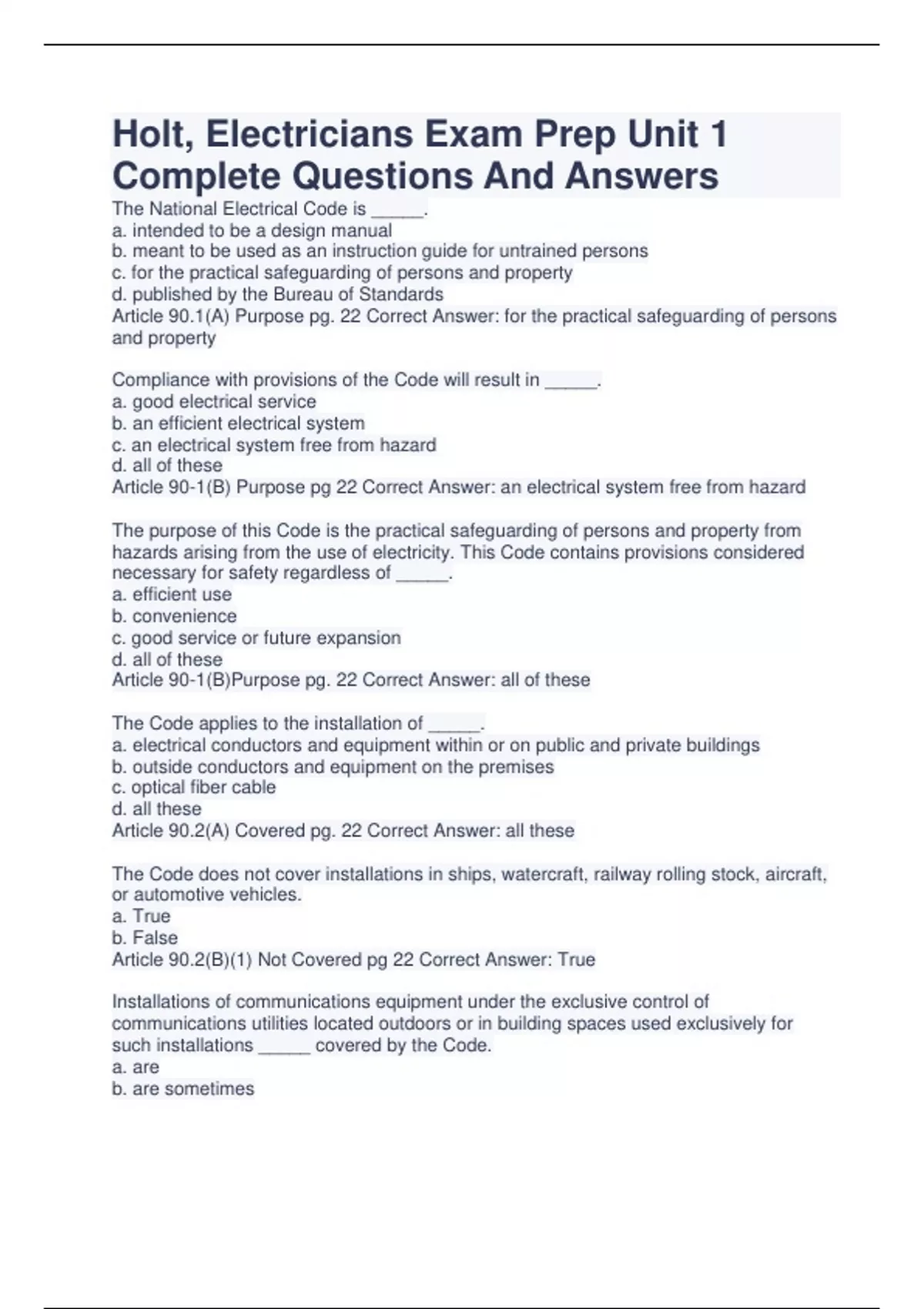 Holt, Electricians Exam Prep Unit 1 Complete Questions And Answers The National Electrical Code is _____. a. intended to be a design manual b. meant to be used as an instruction guide for untrained persons c. for the practical safeguarding of persons and property d. published by the Bureau of Standards Article 90.1(A) Purpose pg. 22 Correct Answer: for the practical safeguarding of persons and property Compliance with provisions of the Code will result in _____. a. good electrical service b. an efficient electrical system c. an electrical system free from hazard d. all of these Article 90-1(B) Purpose pg 22 Correct Answer: an electrical system free from hazard The purpose of this Code is the practical safeguarding of persons and property from hazards arising from the use of electricity. This Code contains provisions considered necessary for safety regardless of _____. a. efficient use