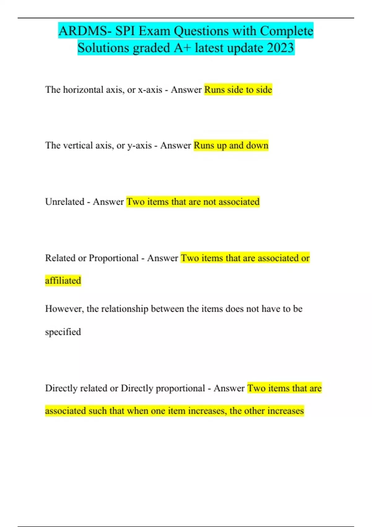 The horizontal axis, or x-axis - Answer Runs side to side The vertical axis, or y-axis - Answer Runs up and down Unrelated - Answer Two items that are not associated Related or Proportional - Answer Two items that are associated or affiliated However, the relationship between the items does not have to be specified Directly related or Directly proportional - Answer Two items that are associated such that when one item increases, the other increases