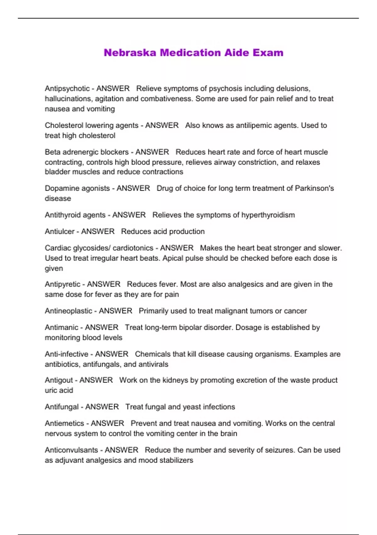 Antipsychotic - ANSWER Relieve symptoms of psychosis including delusions, hallucinations, agitation and combativeness. Some are used for pain relief and to treat nausea and vomiting Cholesterol lowering agents - ANSWER Also knows as antilipemic agents. Used to treat high cholesterol Beta adrenergic blockers - ANSWER Reduces heart rate and force of heart muscle contracting, controls high blood pressure, relieves airway constriction, and relaxes bladder muscles and reduce contractions Dopamine agonists - ANSWER Drug of choice for long term treatment of Parkinson's disease Antithyroid agents - ANSWER Relieves the symptoms of hyperthyroidism Antiulcer - ANSWER Reduces acid production Cardiac glycosides/ cardiotonics - ANSWER Makes the heart beat stronger and slower. Used to treat irregular heart beats. Apical pulse should be checked before each dose is given Antipyretic - ANSWER Reduces fever. Most are also analgesics and are given in the same dose for fever as they are for pain Antineoplastic - ANSWER Primarily used to treat malignant tumors or cancer Antimanic - ANSWER Treat long-term bipolar disorder. Dosage is established by monitoring blood levels Anti-infective - ANSWER Chemicals that kill disease causing organisms. Examples are antibiotics, antifungals, and antivirals Antigout - ANSWER Work on the kidneys by promoting excretion of the waste product uric acid Antifungal - ANSWER Treat fungal and yeast infections Antiemetics - ANSWER Prevent and treat nausea and vomiting. Works on the central nervous system to control the vomiting center in the brain Anticonvulsants - ANSWER Reduce the number and severity of seizures. Can be used as adjuvant analgesics and mood stabilizers