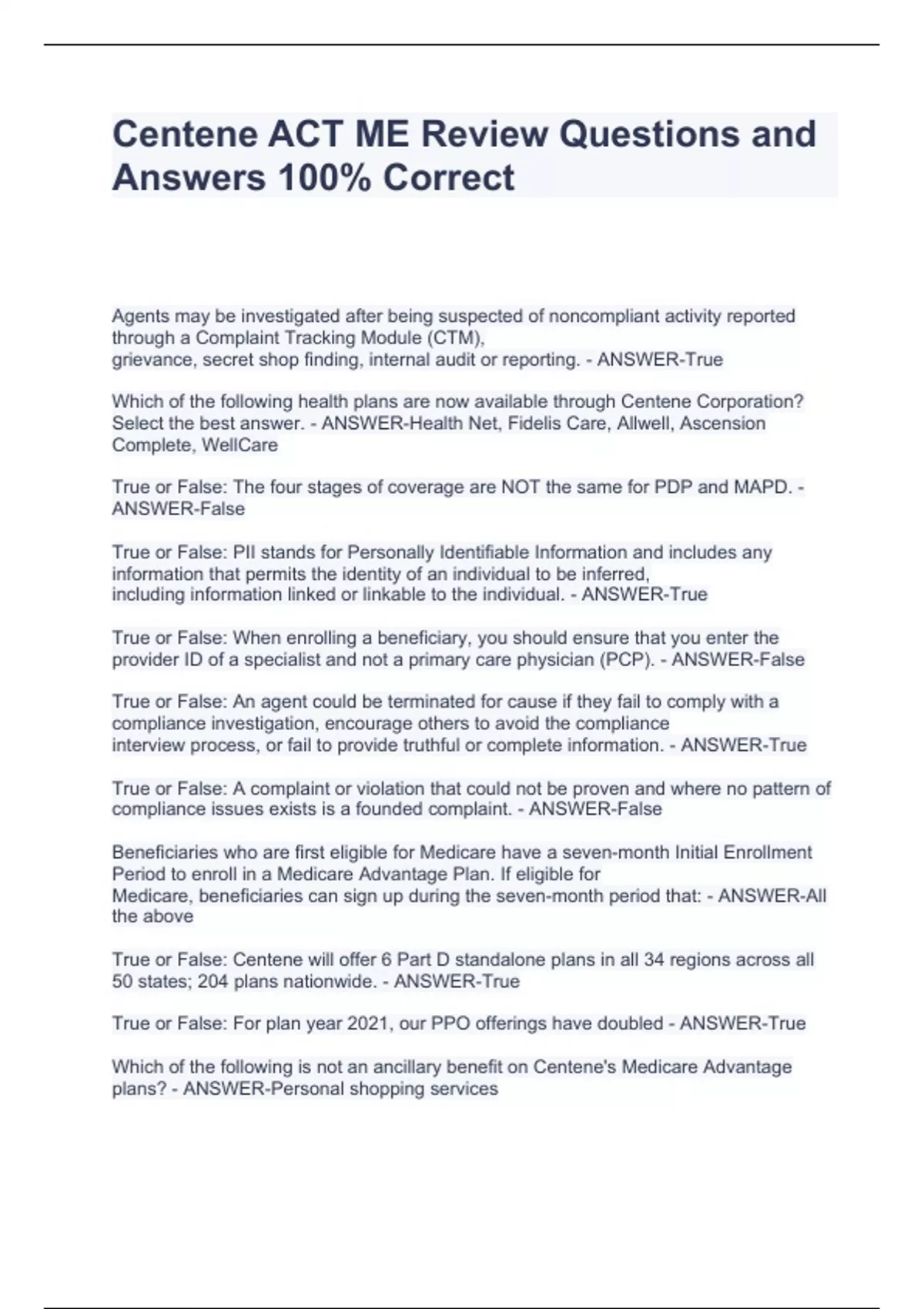 Centene ACT ME Review Questions and Answers 100% Correct Centene ACT ME Review Questions and Answers 100% Correct Centene ACT ME Review Questions and Answers 100% Correct Agents may be investigated after being suspected of noncompliant activity reported through a Complaint Tracking Module (CTM), grievance, secret shop finding, internal audit or reporting. - ANSWER-True Which of the following health plans are now available through Centene Corporation? Select the best answer. - ANSWER-Health Net, Fidelis Care, Allwell, Ascension Complete, WellCare True or False: The four stages of coverage are NOT the same for PDP and MAPD. - ANSWER-False