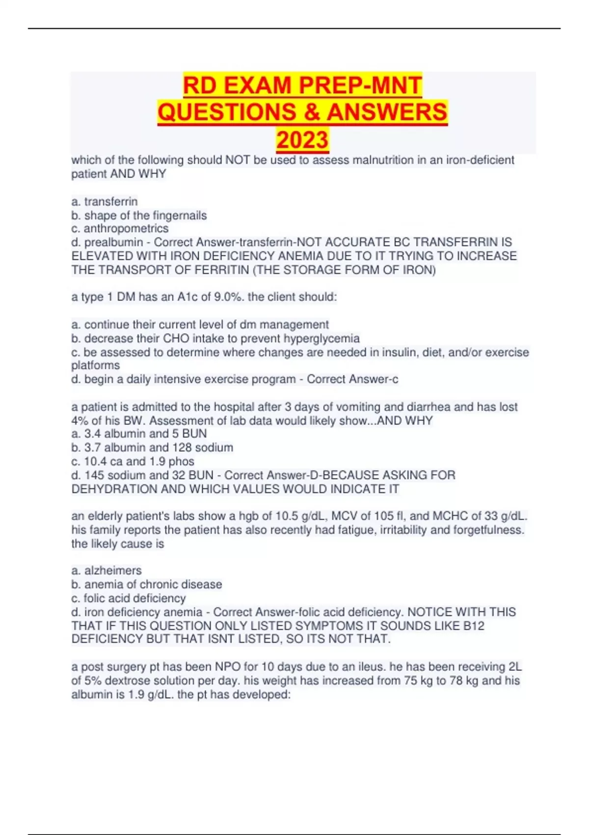 RD EXAM PREP-MNT QUESTIONS & ANSWERS 2023 which of the following should NOT be used to assess malnutrition in an iron-deficient patient AND WHY a. transferrin b. shape of the fingernails c. anthropometrics d. prealbumin - Correct Answer-transferrin-NOT ACCURATE BC TRANSFERRIN IS ELEVATED WITH IRON DEFICIENCY ANEMIA DUE TO IT TRYING TO INCREASE THE TRANSPORT OF FERRITIN (THE STORAGE FORM OF IRON) a type 1 DM has an A1c of 9.0%. the client should: a. continue their current level of dm management b. decrease their CHO intake to prevent hyperglycemia c. be assessed to determine where changes are needed in insulin, diet, and/or exercise platforms d. begin a daily intensive exercise program - Correct Answer-c a patient is admitted to the hospital after 3 days of vomiting and diarrhea and has lost 4% of his BW. Assessment of lab data would likely show...AND WHY a. 3.4 albumin and 5 BUN b. 3.7 albumin and 128 sodium c. 10.4 ca and 1.9 phos d. 145 sodium and 32 BUN - Correct Answer-D-BECAUSE ASKING FOR DEHYDRATION AND WHICH VALUES WOULD INDICATE IT an elderly patient's labs show a hgb of 10.5 g/dL, MCV of 105 fl, and MCHC of 33 g/dL. his family reports the patient has also recently had fatigue, irritability and forgetfulness. the likely cause is a. alzheimers b. anemia of chronic disease c. folic acid deficiency d. iron deficiency anemia - Correct Answer-folic acid deficiency. NOTICE WITH THIS THAT IF THIS QUESTION ONLY LISTED SYMPTOMS IT SOUNDS LIKE B12 DEFICIENCY BUT THAT ISNT LISTED, SO ITS NOT THAT. a post surgery pt has been NPO for 10 days due to an ileus. he has been receiving 2L of 5% dextrose solution per day. his weight has increased from 75 kg to 78 kg and his albumin is 1.9 g/dL. the pt has developed: CONTINUES...