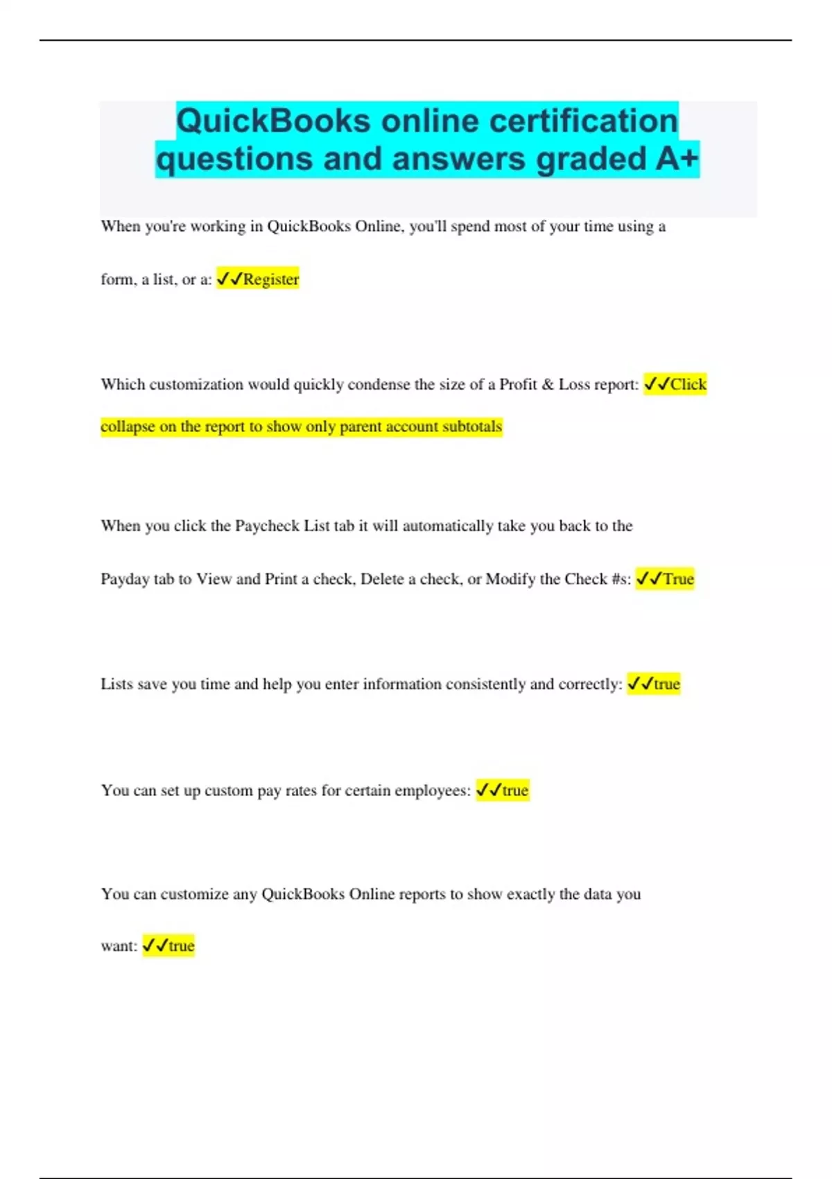 QuickBooks online certification questions and answers graded A+