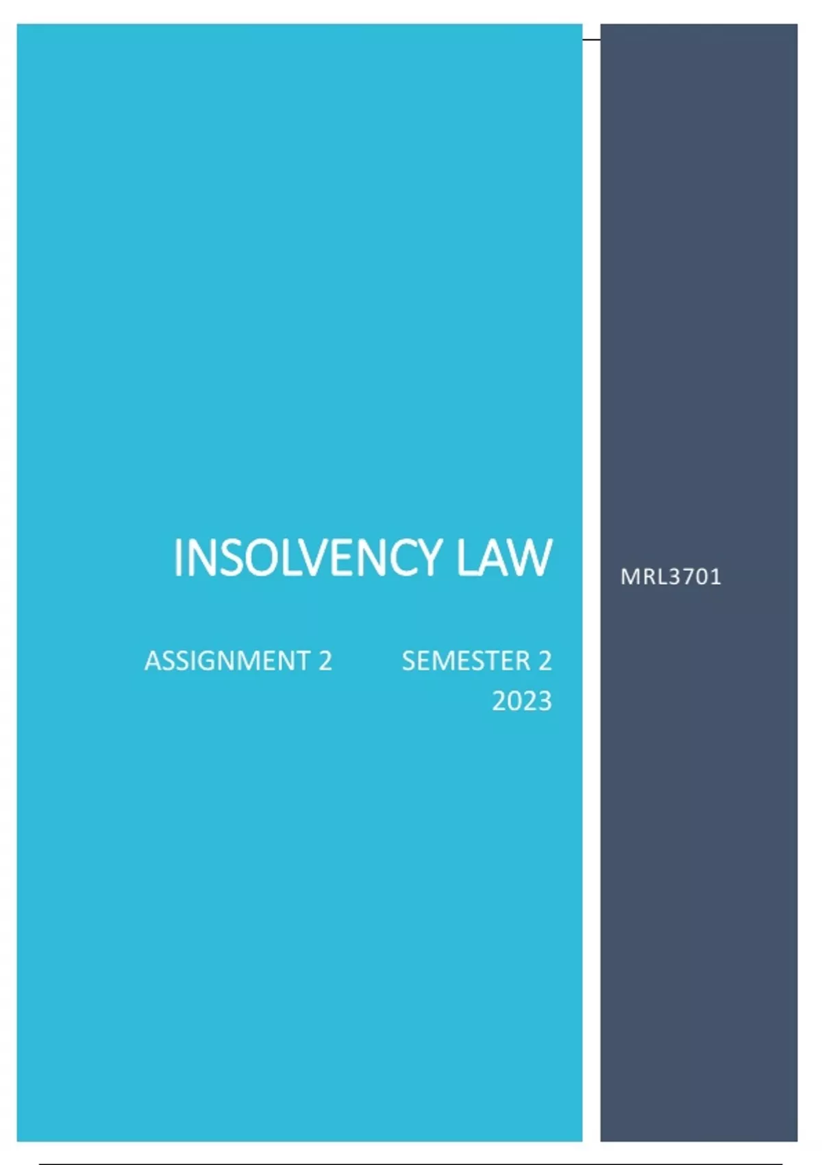 2023 SEMESTER 2 ASSIGNMENT 2 - Insolvency Law - MRL3701 (MRL3701)