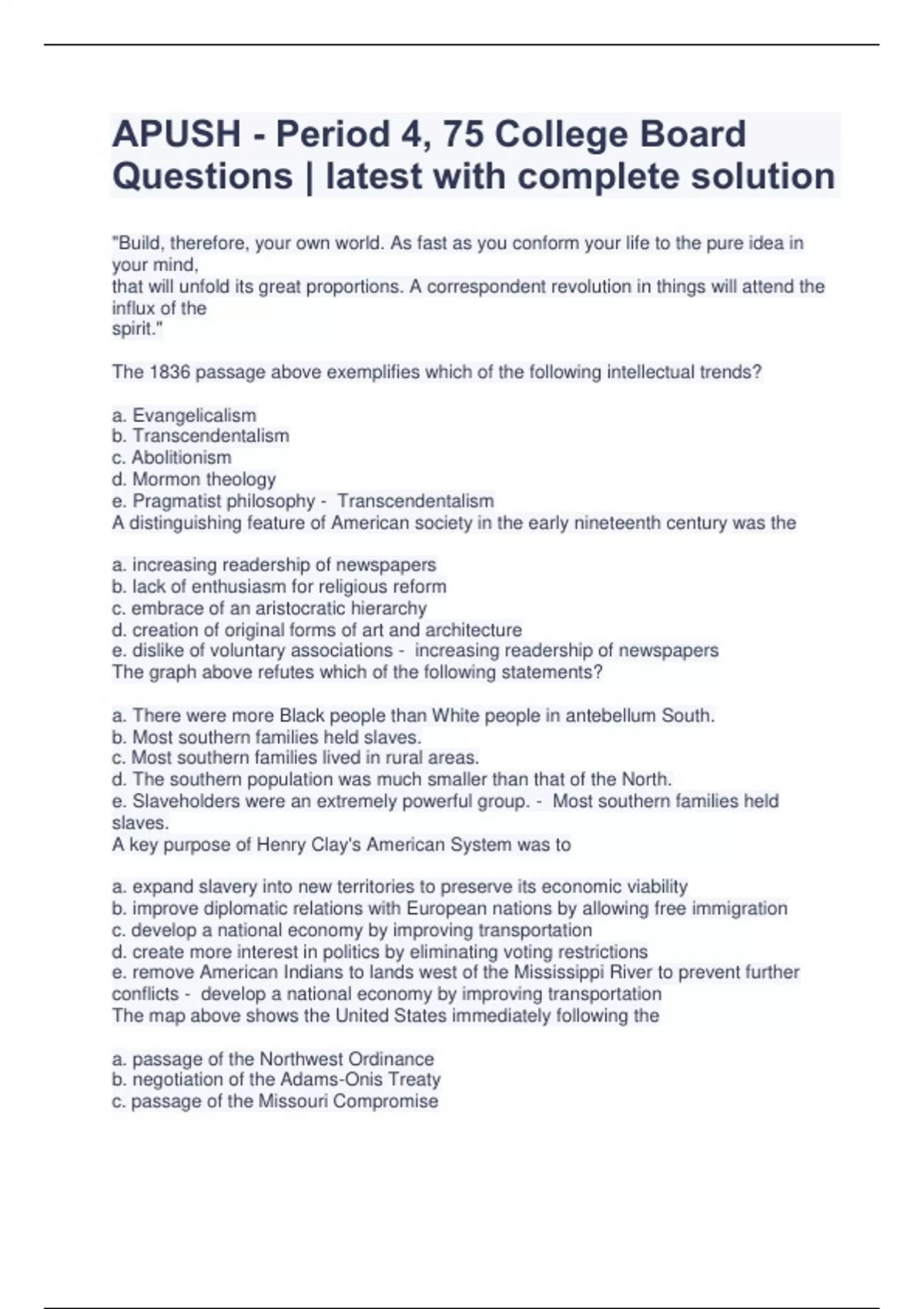 APUSH - Period 4, 75 College Board Questions | latest with complete solution "Build, therefore, your own world. As fast as you conform your life to the pure idea in your mind, that will unfold its great proportions. A correspondent revolution in things will attend the influx of the spirit." The 1836 passage above exemplifies which of the following intellectual trends? a. Evangelicalism b. Transcendentalism c. Abolitionism d. Mormon theology e. Pragmatist philosophy - Transcendentalism A distinguishing feature of American society in the early nineteenth century was the a. increasing readership of newspapers b. lack of enthusiasm for religious reform c. embrace of an aristocratic hierarchy d. creation of original forms of art and architecture e. dislike of voluntary associations - increasing readership of newspapers The graph above refutes which of the following statements? a. There were more Black people than White people in antebellum South. b. Most southern families held slaves. c. Most southern families lived in rural areas. d. The southern population was much smaller than that of the North. e. Slaveholders were an extremely powerful group. - Most southern families held slaves. A key purpose of Henry Clay's American System was to a. expand slavery into new territories to preserve its economic viability b. improve diplomatic relations with European nations by allowing free immigration c. develop a national economy by improving transportation d. create more interest in politics by eliminating voting restrictions e. remove American Indians to lands west of the Mississippi River to prevent further conflicts - develop a national economy by improving transportation The map above shows the United States immediately following the a. passage of the Northwest Ordinance b. negotiation of the Adams-Onis Treaty c. passage of the Missouri Compromise d. settlement of the Mexican War e. passage of the Compromise of 1850 - passage of the Missouri Compromise The picture above best expresses which of the following middle-class views about women in the mid-nineteenth century? a. Women were the moral and spiritual strength of the family. b. Women were naturally suited to become ministers. c. Women played a subordinate role to men in parenting children. d. Women had earned the right to vote due to their important role as mothers. e. Women should limit the number of their children by delaying marriage. - Women were the moral and spiritual strength of the family. All of the following accurately describe Jefferson's purchase of the Louisiana Territory from France EXCEPT: a. It opened the Mississippi River permanently to western farmers. b. It ended the threat of American Indian raids on western settlements. c. It was made possible by the failure of Napoleon's forces to suppress a salve revolt in Haiti. d. It showed Jefferson's considerable flexibility in dealing with foreign policy. e. It violated Jefferson's own view concerning strict construction of the Constitution. - It ended the threat of American Indian raids on western settlements. All of the following contributed to the growth of the free African American population in the United States in the early nineteenth century EXCEPT a. the gradual emancipation laws of individual states b. manumission granted for Revolutionary War service c. manumission granted by slaveholders' wills d. natural increase among free African Americans e. federal constitutional provisions for emancipation - federal constitutional provisions for emancipation The drawing above has been cited as evidence of the nineteenth-century middle-class view of the a. home as a refuge from the world rather than as a productive unit b. declining influence of women in the family structure c. economic value of children to families d. importance of religious education e. widening role of women in society - home as a refuge from the world rather than as a productive unit Andrew Jackson supported all of the following EXCEPT a. Indian removal b. the right of nullification c. the removal of federal deposits from the Bank of the United States d. annexation of new territory e. use of the presidential veto power - the right of nullification Andrew Jackson vetoed the recharter of the Bank of the United States partly because he believed that the bank a. concentrated too much power in the hands of a few people b. gave too many loans to assist unstable state and local banks c. was secretly funding the abolitionist movement d. was overly subsidized by state tax monies e. planned to create new paper money unsupported by gold or silver - concentrated too much power in the hands of a few people "[George] Washington's gratitude was genuine . . . but the fact remains that the members of the association, who had embarked on a very unfeminine enterprise, were ultimately deflected into a traditional domestic role.... Ironically and symbolically, the Philadelphia women of 1780, who had tried to establish an unprecedented nationwide female organization, ended up as what one amused historian has termed 'General Washington's Sewing Circle.' "Male Revolutionary leaders too regarded women's efforts with wry condescension. . . . The women, on the other hand,... could reflect proudly that 'whilst our friends were exposed to the hardships and dangers of the fields of war for our protection, we were exerting at home our little labours to administer to their comfort and alleviate their toil.'" Mary Beth Norton, historian, "The Philadelphia Ladies Association," American Heritage, 1980 During and immediately after the Revolutionary era, which of the following resulted most directly from the efforts of women such as those described in the excerpt? a. The extension of voting rights to women nationwide b. The reform of laws regarding women's property ownership c. The creation of a national network of abolitionist societies d. The ideal that women would teach republican values - The ideal that women would teach republican values "[Geor