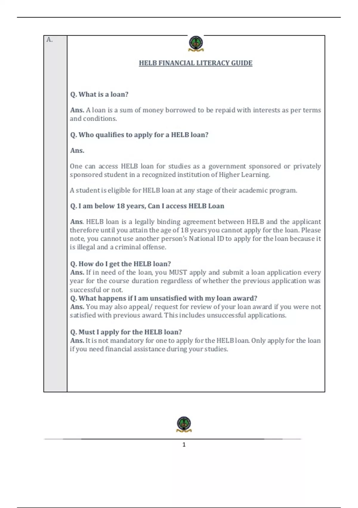 Q. What is a loan? Ans. A loan is a sum of money borrowed to be repaid with interests as per terms and conditions. Q. Who qualifies to apply for a HELB loan? Ans. One can access HELB loan for studies as a government sponsored or privately sponsored student in a recognized institution of Higher Learning. A student is eligible for HELB loan at any stage of their academic program.