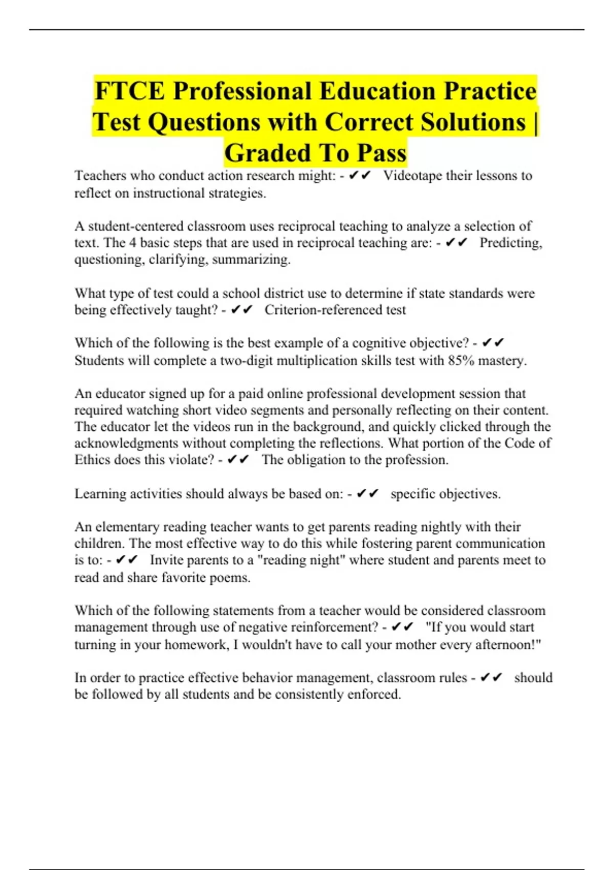 FTCE Professional Education Practice Test Questions with Correct Solutions | Graded To Pass