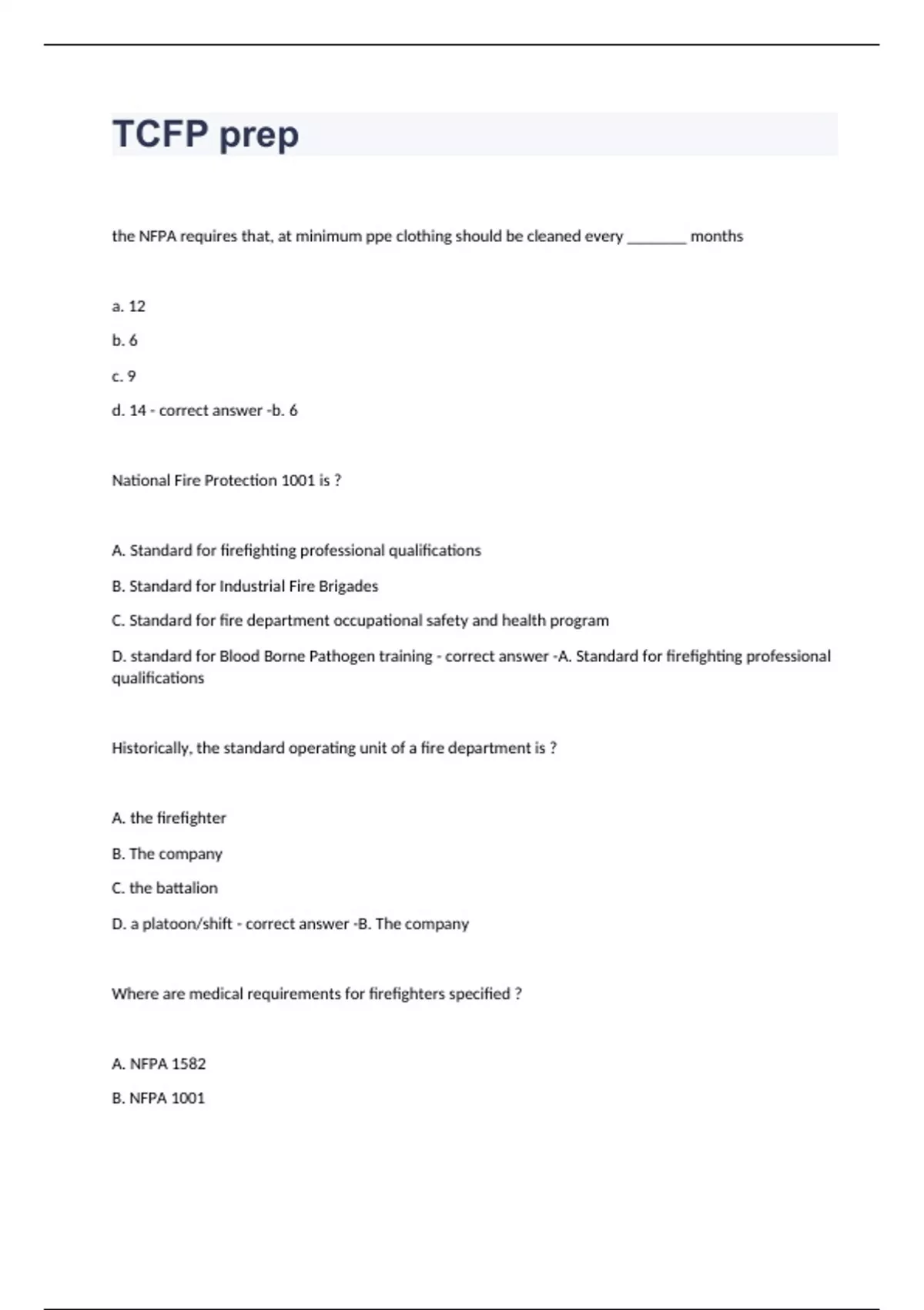 the NFPA requires that, at minimum ppe clothing should be cleaned every _______ months a. 12 b. 6 c. 9 d. 14 - correct answer -b. 6 National Fire Protection 1001 is ? A. Standard for firefighting professional qualifications B. Standard for Industrial Fire Brigades C. Standard for fire department occupational safety and health program D. standard for Blood Borne Pathogen training - correct answer -A. Standard for firefighting professional qualifications Historically, the standard operating unit of a fire department is ? A. the firefighter B. The company C. the battalion D. a platoon/shift - correct answer -B. The company Where are medical requirements for firefighters specified ? A. NFPA 1582 B. NFPA 1001 C. NFPA 1500