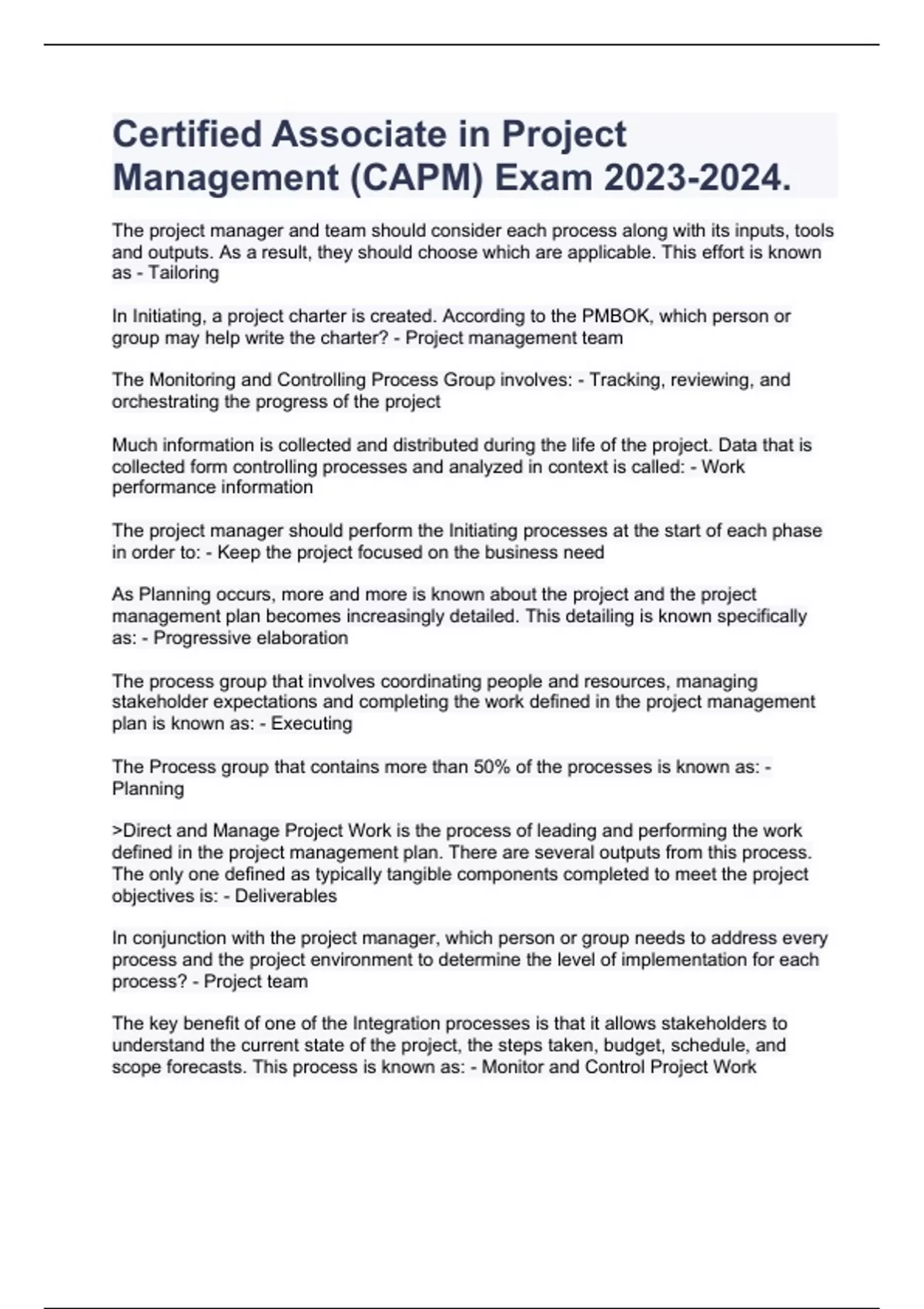 Certified Associate in Project Management (CAPM) Exam . The project manager and team should consider each process along with its inputs, tools and outputs. As a result, they should choose which are applicable. This effort is known as - In Initiating, a project charter is created. According to the PMBOK, which person or group may help write the charter? - The Monitoring and Controlling Process Group involves: - Much information is collected and distributed during the life of the project. Data that is collected form controlling processes and analyzed in context is called: - The project manager should perform the Initiating processes at the start of each phase in order to: - As Planning occurs, more and more is known about the project and the project management plan becomes increasingly detailed. This detailing is known specifically as: - The process group that involves coordinating people and resources, managing stakeholder expectations and completing the work defined in the project management plan is known as: - The Process group that contains more than 50% of the processes is known as: - >Direct and Manage Project Work is the process of leading and performing the work defined in the project management plan. There are several outputs from this process. The only one defined as typically tangible components completed to meet the project objectives is: - In conjunction with the project manager, which person or group needs to address every process and the project environment to determine the level of implementation for each process? - The key benefit of one of the Integration processes is that it allows stakeholders to understand the current state of the project, the steps taken, budget, schedule, and scope forecasts. This process is known as: - The project manager should participate in the development of the project charter to better understand the project requirements. Understanding these requirements will better allow for: - As a change control expert, you are asked to work on a plan that documents how changes will be controlled and monitored on the project. Additionally you are told it will ultimately become part of the project management plan. This document is known as a: - Direct and Manage Project Work requires review of all project changes and the implementation of approved changes. This may lead to corrective action which is defined as: - As a project team member, you know that the change control board approves or rejects all changes. During a team meeting, you ask the project manager whose responsibility it is to schedule and implement the changes. She tells you it is the responsibility of: - On reading the PMBOK, you are uncertain about how the Monitor and Control Project Work Process fits into the project. On discussion with the project manager, he explains to you that: - The project manager has held a meeting to describe what documents will be needed to help define the scope baseline. A major document is the WBS. As a member of the project team with expertise in the project area, your primary role will be to assist in: - A diagram that assists in gathering requirements by showing a business system and how other people and systems interact with it is known as a: You are new to the organization and are working on your first project with your team. In your last company, scope definition always preceded requirements. Your project manager informs you that they follow PMBOK best practices which call for: - The requirements traceability matrix is important because it: - A numbering system used to uniquely identify each component of the work breakdown structure is called: - The team must identify activities in order to provide a basis for estimating, scheduling, executing, monitoring and controlling the project work. These activities are identified by breaking down, or decomposing, the: - The technique in which the work to be accomplished in the near term is planned in detail, while the work in the future is planned at a higher level is called: - Given an estimate (in days) of 7 Optimistic, 15 Most Likely and 25 Pessimistic, what is the estimated range within two standard deviations? - When calculating activity durations, the estimating method that uses historical data and is frequently used when there is a limited amount of detailed information is referred to as: - Management reserves, for both time and cost, are set aside for unforeseen work or expenditures. These reserves are used to address: - A simulation that involves calculating multiple project durations using probability distributions is called: - An Enterprise Environmental Factor that may be taken into consideration when Planning Cost Management is: - Early in the project, the sponsor provides a range for what the project might cost. The range is $75,000 to $175,000 with a base cost of $100,000. What is this estimate referred to as? - As of the measurement point, your project's TCPI is 1.33 and your CPI is .85. How would you interpret this information? - T Perform Quality Assurance does audits not only to identify all good and best practices being implemented but because: Control Quality checks for correctness, which according to PMBOK is a function of: - In one phase or stage of the Tuckman ladder, the environment can become counterproductive if team members are not collaborative and open to ideas. It is called: You and another team member have had a hard time agreeing on how to proceed on a series of activities and now it is starting to become a problem. Since you are unable to come to a conclusive resolution, you mutually decide to retreat from the conflict for now to have it later resolved by others. This is known as: A RACI chart is typically a matrix that shows an activity or work package along with the person who is responsible, accountable, to be consulted, or to be informed. It is a type of: - Interactive communication, push communication and pull communication are tools and techniques of Plan Communications Managemen