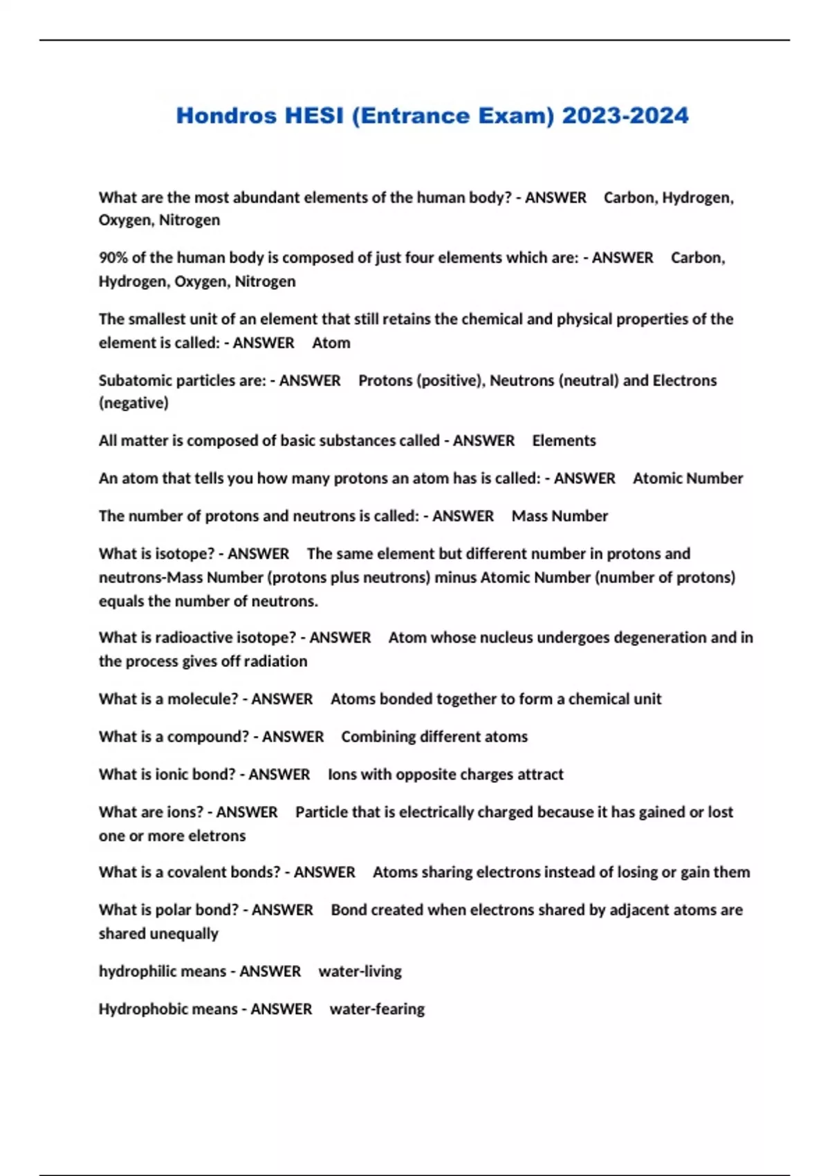 What are the most abundant elements of the human body? - ANSWER Carbon, Hydrogen, Oxygen, Nitrogen 90% of the human body is composed of just four elements which are: - ANSWER Carbon, Hydrogen, Oxygen, Nitrogen The smallest unit of an element that still retains the chemical and physical properties of the element is called: - ANSWER Atom