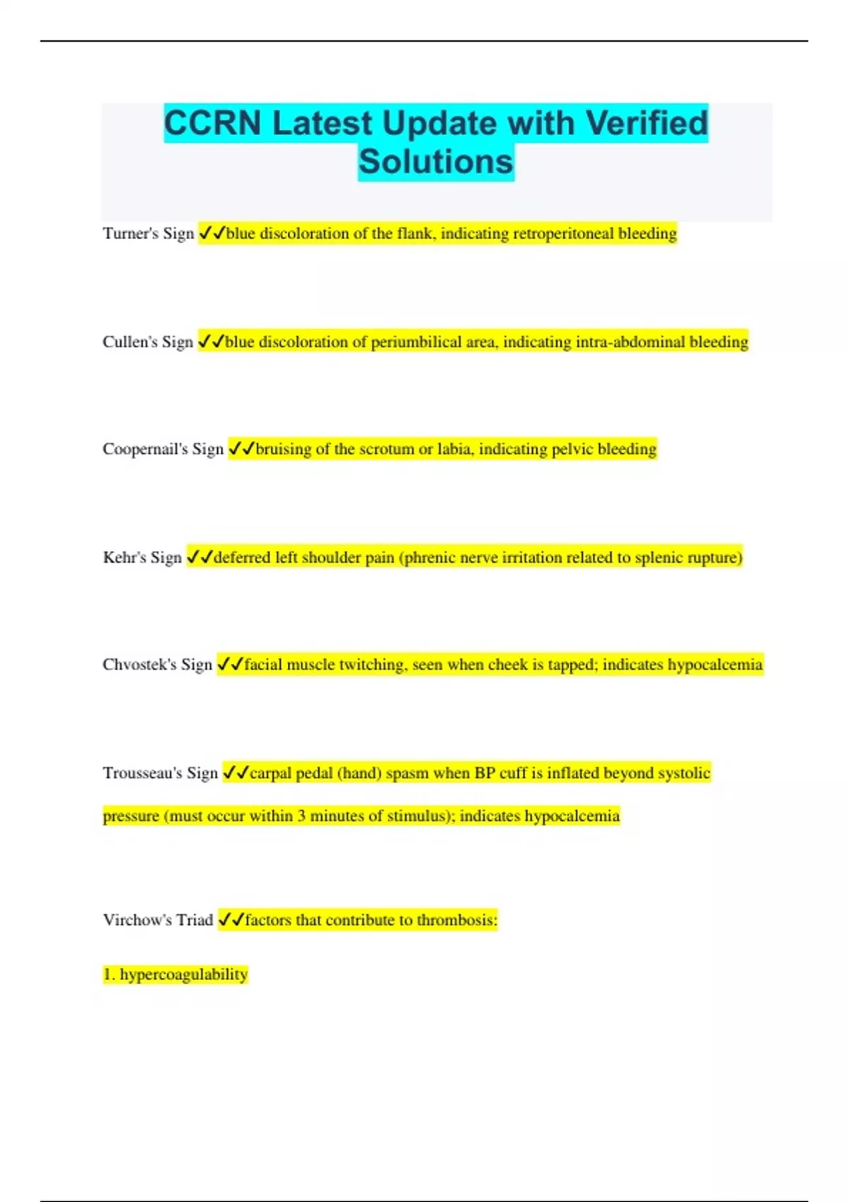 CCRN Latest Update with Verified Solutions Turner's Sign blue discoloration of the flank, indicating retroperitoneal bleeding Cullen's Sign blue discoloration of periumbilical area, indicating intra-abdominal bleeding Coopernail's Sign bruising of the scrotum or labia, indicating pelvic bleeding Kehr's Sign deferred left shoulder pain (phrenic nerve irritation related to splenic rupture) Chvostek's Sign facial muscle twitching, seen when cheek is tapped; indicates hypocalcemia Trousseau's Sign carpal pedal (hand) spasm when BP cuff is inflated beyond systolic pressure (must occur within 3 minutes of stimulus); indicates hypocalcemia Virchow's Triad factors that contribute to thrombosis: 1. hypercoagulability 2. hemodynamic changes (stasis, turbulence) 3. blood vessel injury/dysfunction Beck's Triad associated with acute cardiac tamponade: - low arterial blood pressure - distended neck veins - distant, muffled heart sounds Ashman's Phenomenon long R-R interval followed by short R-R interval Eisenmenger's Syndrome occurs when the increased pressure of the blood flow in the lung becomes so great that the direction of blood flow through the shunt reverses Kernig's Sign positive when the thigh is flexed at the hip and knee at 90 degree angles, and subsequent extension in the knee is painful (leading to resistance). This may indicate subarachnoid hemorrhage or meningitis. Brudzinski's Sign involuntary flexion of the hip and knee when the neck is bent forward, indicates meningitis Preload measure of VOLUME of blood that causes stretch in the myocardial cells just prior to systole determines if