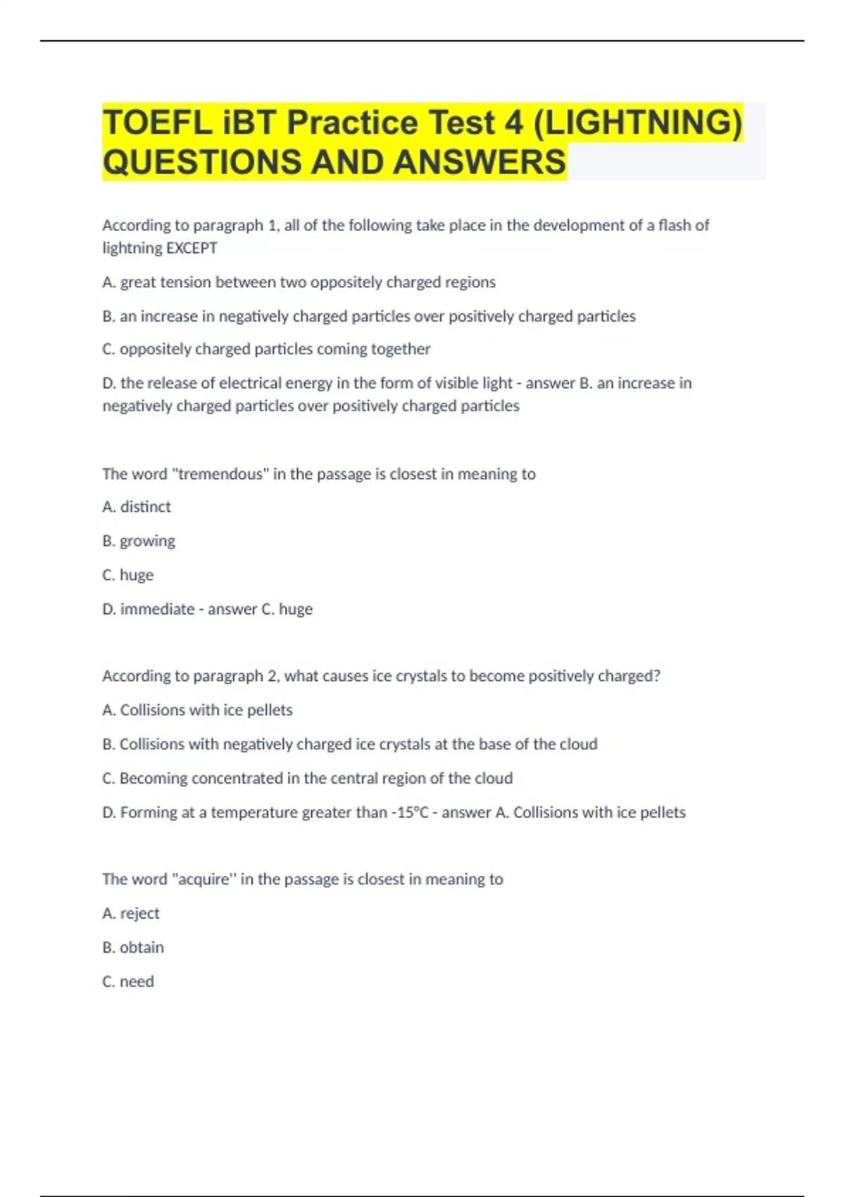TOEFL iBT Practice Test 4 (LIGHTNING) QUESTIONS AND ANSWERS
