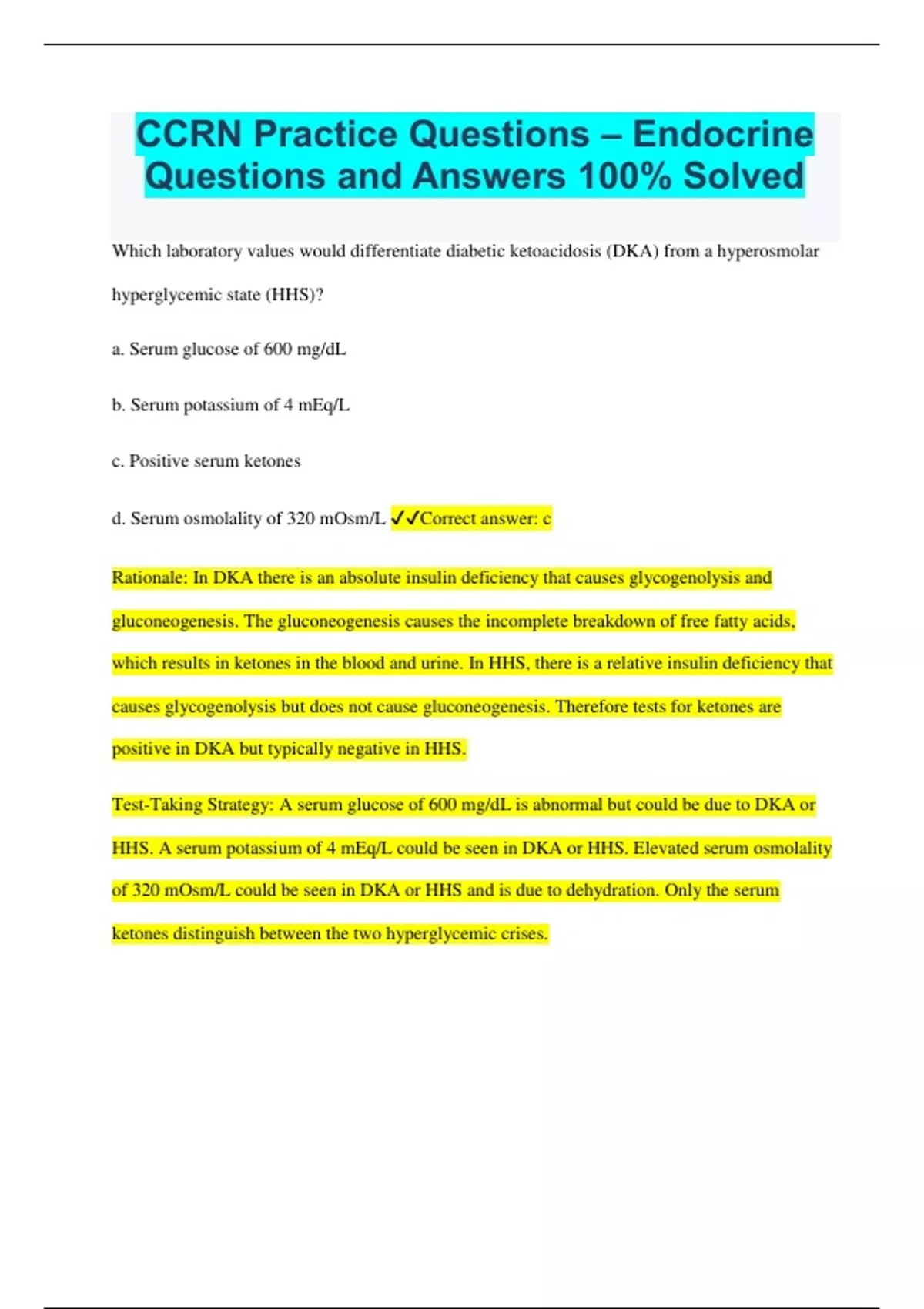 CCRN Practice Questions – Endocrine Questions and Answers 100% Solved Which laboratory values would differentiate diabetic ketoacidosis (DKA) from a hyperosmolar hyperglycemic state (HHS)? a. Serum glucose of 600 mg/dL b. Serum potassium of 4 mEq/L c. Positive serum ketones d. Serum osmolality of 320 mOsm/L Correct answer: c Rationale: In DKA there is an absolute insulin deficiency that causes glycogenolysis and gluconeogenesis. The gluconeogenesis causes the incomplete breakdown of free fatty acids, which results in ketones in the blood and urine. In HHS, there is a relative insulin deficiency that causes glycogenolysis but does not cause gluconeogenesis. Therefore tests for ketones are positive in DKA but typically negative in HHS. Test-Taking Strategy: A serum glucose of 600 mg/dL is abnormal but could be due to DKA or HHS. A serum potassium of 4 mEq/L could be seen in DKA or HHS. Elevated serum osmolality of 320 mOsm/L could be seen in DKA or HHS and is due to dehydration. Only the serum ketones distinguish between the two hyperglycemic crises. A patient with type 1 diabetes mellitus is discharged after myocardial infarction. When teaching the patient about his medications, it is important to inform him that which of the following medications would prevent the early symptoms of hypoglycemia? a. Verapamil (Calan) b. Diazepam (Valium) c. Metoprolol (Lopressor) d. Humulin insulin Correct answer: c Rationale: The early symptoms of hypoglycemia are mediated by the sympathetic nervous system. Sympathetic blocking agents would block these symptoms. Metoprolol (Lopressor) is a beta-blocker, which would block the tachycardia, nervousness, and diaphoresis indicative of early hypoglycemia. Test-Taking Strategy: Think "prevent equals block." Option a is a calcium channel blocker, and option c is a beta-blocker. Remember that beta in beta-blocker refers to the receptors of the sympathetic nervous system and that the early indications of hypoglycemia are sympathetic nervous system symptoms. Choose option c A patient received Humulin NPH insulin at 7 AM. He was nauseated and vomiting at lunchtime and did not eat. It is now 3 PM. What are the early signs of hypoglycemia for which the nurse should monitor? a. Decreased skin turgor; abdominal pain; fever b. Tachycardia; tachypnea; diaphoresis c. Thirst; hypotension; fruity odor to breath d. Flushed skin; confusion; rapid, deep breathing Correct answer: b Rationale: The early signs of hypoglycemia are mediated by the sympathetic nervous system, which acts to mobilize glucose stores. Later signs of hypoglycemia are related to low glucose levels in the brain (neuroglycopenia). Test-Taking Strategy: Remember that sympathetic nervous system innervation occurs in any physiologic stressor. Because the question says "early," choose the option that identifies sympathetic nervous system signs. Choose option b. A patient received Humulin NPH insulin at 7 AM. He was nauseated and vomiting at lunchtime and did not eat. If this patient develops manifestations of hypoglycemia, treatment would include: a. 25 mL of 50% dextrose in water (D50W). b. glucagon intramuscularly. c. 4