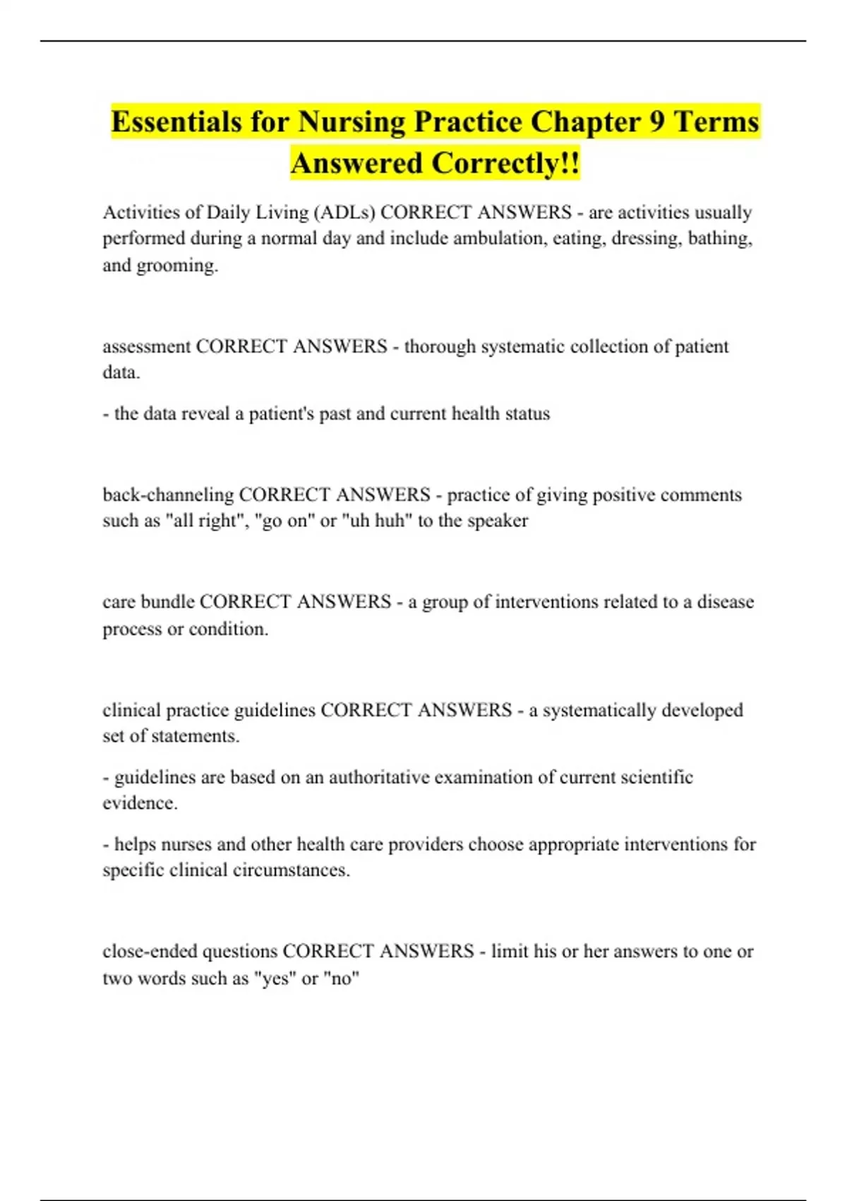 Essentials for Nursing Practice Chapter 9 Terms Answered Correctly!!