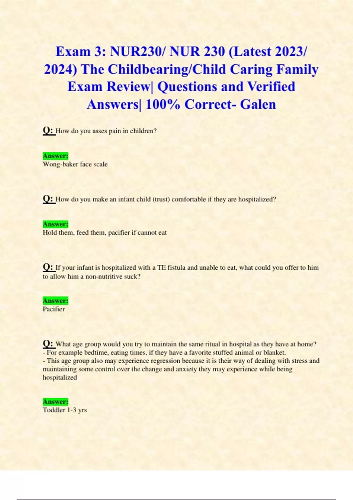 Exam 3: NUR230/ NUR 230 (Latest 2023/ 2024) The Childbearing/Child Caring Family Exam Review| Questions and Verified Answers| 100% Correct- Galen Q: C infant child (trust) comfortable if they are hospitalized? Answer: Hold them, feed them, pacifier if cannot eat Q: If your infant is hospitalized with a TE fistula and unable to eat, what could you offer to him to allow him a non-nutritive suck? Answer: Pacifier Q: What age group would you try to maintain the same ritual in hospital as they have at home? - For example bedtime, eating times, if they have a favorite stuffed animal or blanket. - This age group also may experience regression because it is their way of dealing with stress and maintaining some control over the change and anxiety they may experience while being hospitalized Answer: Toddler 1-3 yrs Q: What age group would you begin to be able to explain why they are in the hospital? Answer: Preschooler 3-6 yrs Q: This age group you will be able to prepare them more for a hospitalization and give more information and explanations - They will also try to negotiate with you by saying a few more minutes, I'm not ready yet, give me 30 more minutes Answer: School age 6-12 yrs Q: An infant will develop a social smile when? Answer: 2 mo Q: Posterior fontanel closes by when? Answer: 3 mo Q: When can an infant typically fully roll over? Answer: 5-6 mo Q: An infant should be sitting unsupported by how many months? Answer: 8 mo Q: An infant can waive bye bye when? Answer: 10 mo Q: When can an infant walk with assistance? Answer: 10-12 mo Q: Growth spurts in girls typically happens at what age? Answer: 10 yrs Q: When can a toddler begin to kick a ball? Answer: 24 mo Q: When can a child typically tie their shoes? Answer: 5 yrs