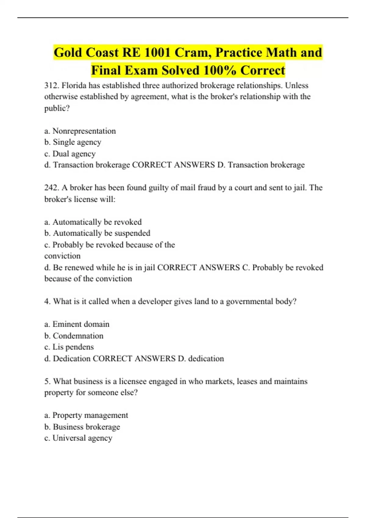 Gold Coast RE 1001 Cram, Practice Math and Final Exam Solved 100% Correct