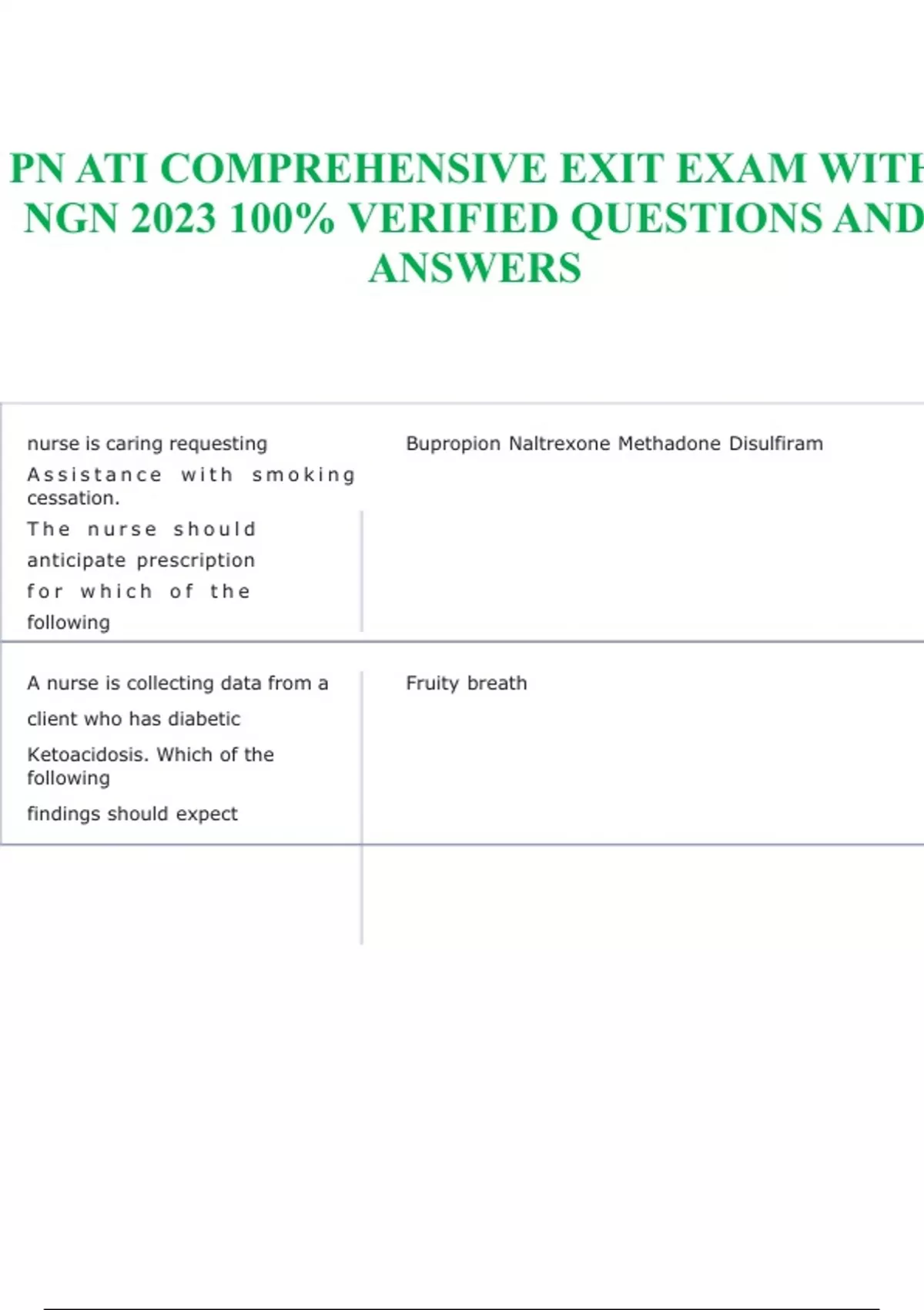 PN ATI COMPREHENSIVE EXIT EXAM WITH NGN 2023 100% VERIFIED QUESTIONS AND ANSWERS nurse is caring requesting Assistance with smoking cessation. The nurse should anticipate prescription for which of the following Bupropion Naltrexone Methadone Disulfiram A nurse is collecting data from a Fruity breath client who has diabetic Ketoacidosis. Which of the following findings should expect