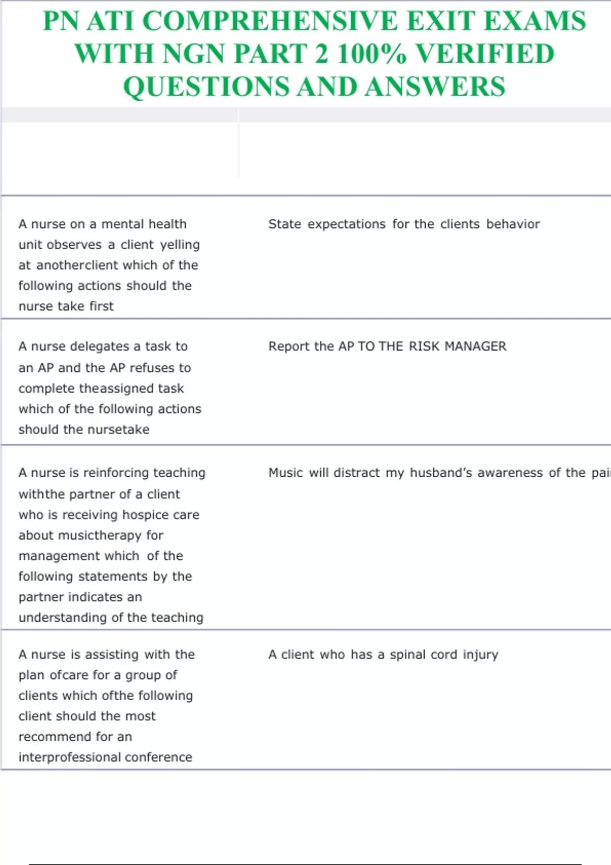 PN ATI COMPREHENSIVE EXIT EXAMS WITH NGN PART 2 100% VERIFIED QUESTIONS AND ANSWERS A nurse on a mental health State expectations for the clients behavior unit observes a client yelling at anotherclient which of the following actions should the nurse take first A nurse delegates a task to Report the AP TO THE RISK MANAGER an AP and the AP refuses to complete theassigned task which of the following actions should the nursetake A nurse is reinforcing teaching withthe partner of a client who is receiving hospice care about musictherapy for management which of the following statements by the partner indicates an understanding of the teaching Music will distract my husband’s awareness of the pain