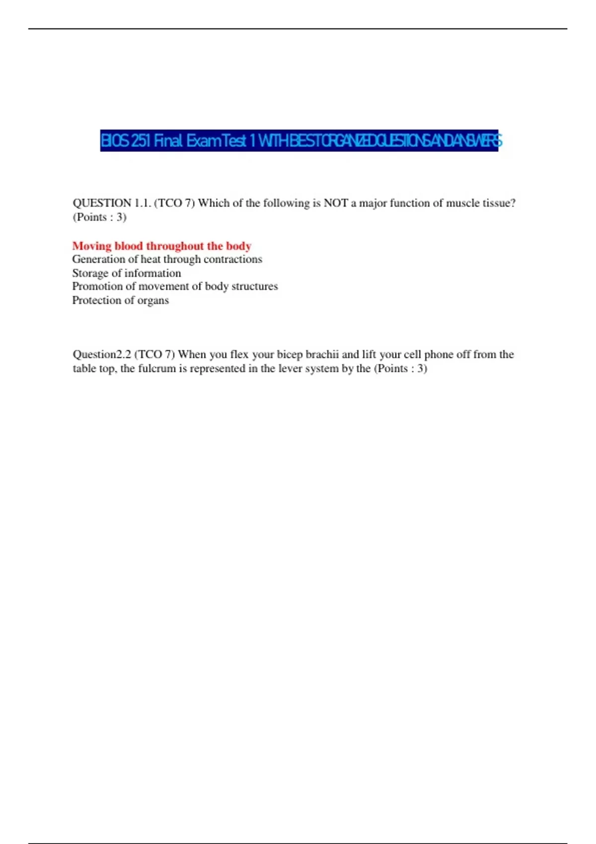 BIOS 251 Final Exam Test 1 WITH BEST ORGANIZED QUESTIONS AND ANSWERS QUESTION 1.1. (TCO 7) Which of the following is NOT a major function of muscle tissue? (Points : 3) Moving blood throughout the body Generation of heat through contractions Storage of information Promotion of movement of body structures Protection of organs Question2.2 (TCO 7) When you flex your bicep brachii and lift your cell phone off from the table top, the fulcrum is represented in the lever system by the (Points : 3) the bicep brachii muscle. the elbow joint. the triceps muscle. the humerus. the cell phone. Question3.3. (TCO7) Which of the following types of cells display the property of electrical excitability? (Points : 3) Smooth muscle cells Cardiac muscle cells Neurons Skeletal muscle cells All of these choices demonstrate electrical excitability. Question4.4. (TCO 7) In an isotonic contraction, the muscle (Points : 3) develops force. shortens. lengthens. both develops force and shortens. both develops force and lengthens. Question5.5. (TCO 7) The form of a muscle that stabilizes the origin of the prime mover so that it can act more efficiently is called the (Points : 3) synergist. agonist. antagonist. fixator. secondarymover. Question6.6. (TCO 8) The component of a neuron that provides the spatial integration of incoming signals is the (Points : 3) axon. soma. myelin sheath. axon hillock. axon terminals.
