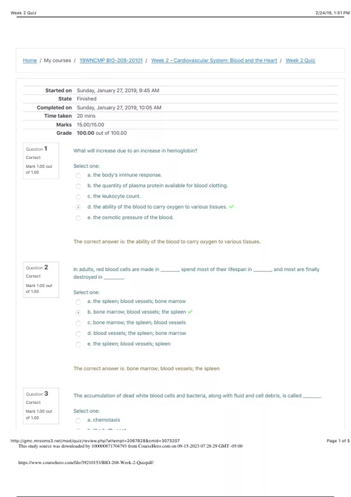 What will increase due to an increase in hemoglobin? Select one: a. the body's immune response. b. the quantity of plasma protein available for blood clotting. c. the leukocyte count. d. the ability of the blood to carry oxygen to various tissues. ! e. the osmotic pressure of the blood. The correct answer is: the ability of the blood to carry oxygen to various tissues. In adults, red blood cells are made in ________, spend most of their lifespan in ________, and most are finally destroyed in _________. Select one: a. the spleen; blood vessels; bone marrow b. bone marrow; blood vessels; the spleen ! c. bone marrow; the spleen; blood vessels d. blood vessels; the spleen; bone marrow e. the spleen;