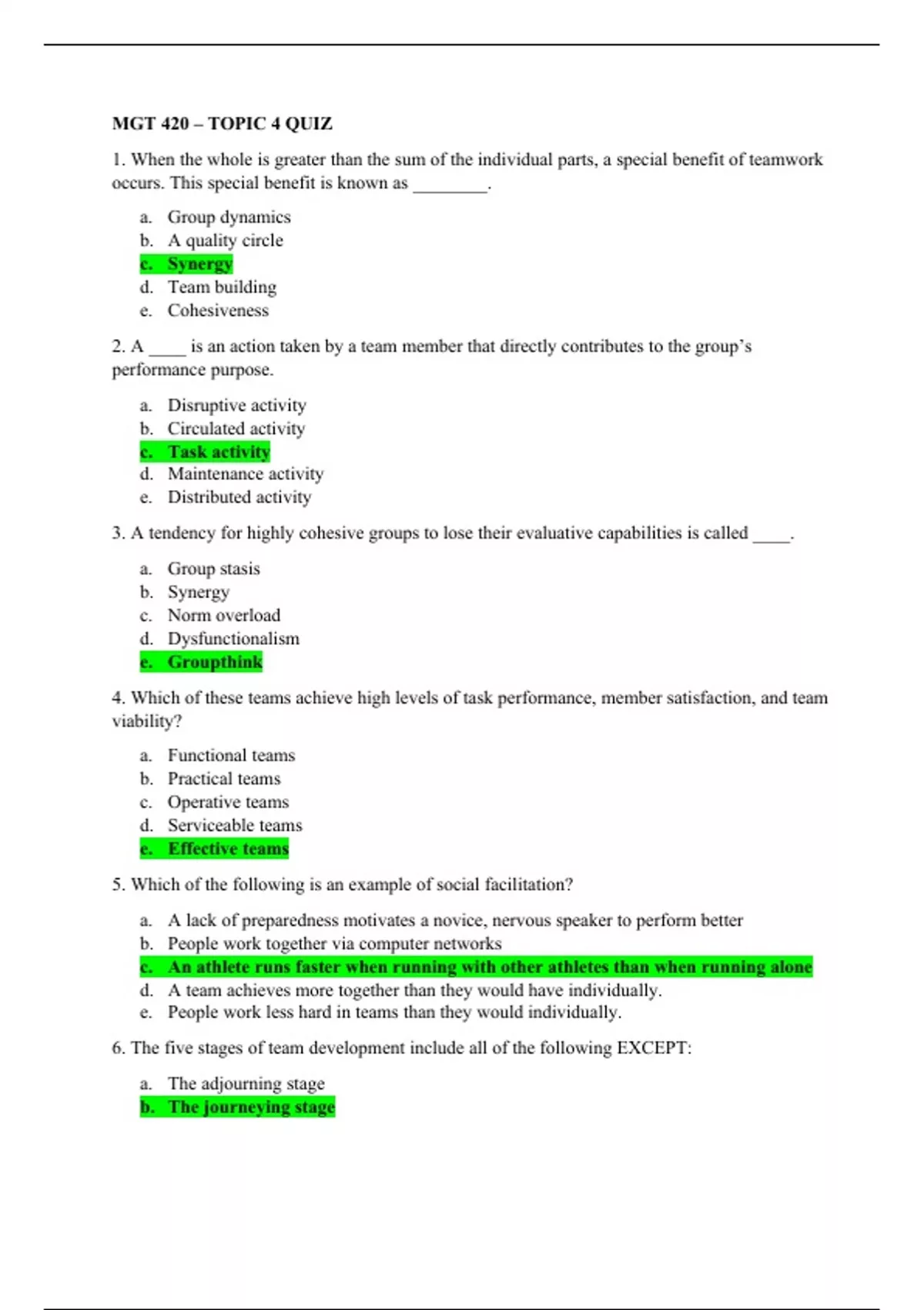 1.Question:When the whole is greater than the sum of the individual parts, a special benefit of teamwork occurs. This special benefit is known as ________. 2.Question:A ____ is an action taken by a team member that directly contributes to the group’s performance purpose. 3.Question:A tendency for highly cohesive groups to lose their evaluative capabilities is called ____. 4.Question:Which of these teams achieve high levels of task performance, member satisfaction, and team viability? 5.Question:Which of the following is an example of social facilitation? 6.Question:The five stages of team development include all of the following EXCEPT: 7.Question:Which of the following is true of role ambiguity? 8.Question:A ____ occurs when a behavior crosses the boundary of acceptable behavior in a relationship. 9.Question:Which of the following statements is true of Simmelian ties?