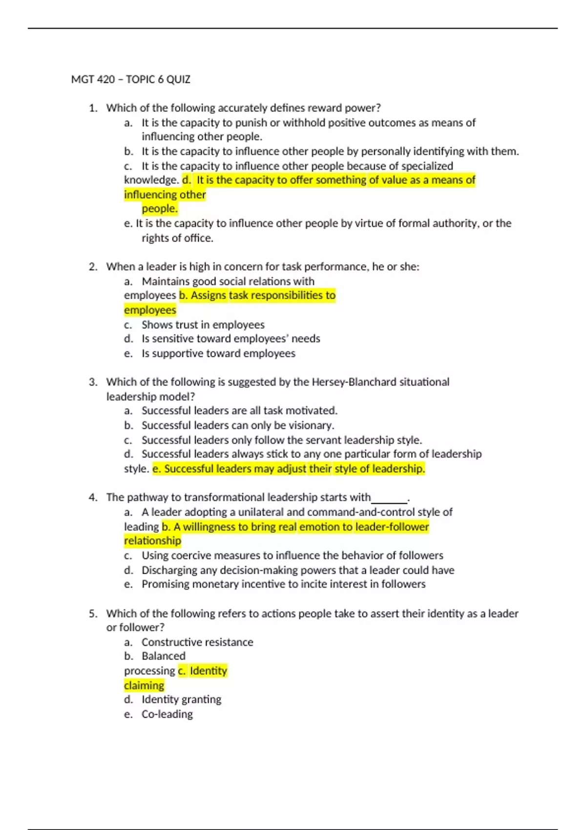 1. Question:Whichofthefollowingaccuratelydefinesrewardpower? 2. Question:Whenaleaderishighinconcernfortaskperformance,heorshe: 3. Question:WhichofthefollowingissuggestedbytheHersey-Blanchardsituationalleadershipmodel? 4. Question:Thepathwaytotransformationalleadershipstartswith . 5. Question:Whichofthefollowingreferstoactionspeopletaketoasserttheiridentityasaleaderorfollower? 6. Question:Thetypeofleadershipthatseesleadershipasagroupphenomenonthatisdispersedamongindividualsisknownas leadership. 7. Question:Whichtypeofleadershipoccurswhenleadershipisdividedsothatnoonepersonhasthepowertoleadunilaterally? 8. Question:Theextenttowhichoneacceptsthatpowerininstitutionsandorganizationsisdistributedunequally isknownas: 9. Question:Whichofthefollowingpowersisderivedfromrelationswithpowerfulothers? 10. Question: refers to a situation in which men and women of otherwise strong personalintegrityandintelligenceengageinunethicalandselfishbehaviorbecausetheybelievetheyareabove the law.