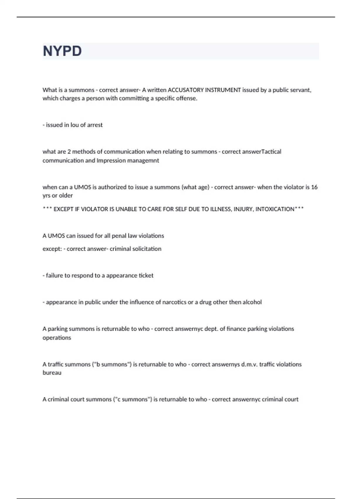 What is a summons - correct answer- A written ACCUSATORY INSTRUMENT issued by a public servant, which charges a person with committing a specific offense. - issued in lou of arrest what are 2 methods of communication when relating to summons - correct answerTactical communication and Impression managemnt when can a UMOS is authorized to issue a summons (what age) - correct answer- when the violator is 16 yrs or older *** EXCEPT IF VIOLATOR IS UNABLE TO CARE FOR SELF DUE TO ILLNESS, INJURY, INTOXICATION*** A UMOS can issued for all penal law violations except: - correct answer- criminal solicitation - failure to resp