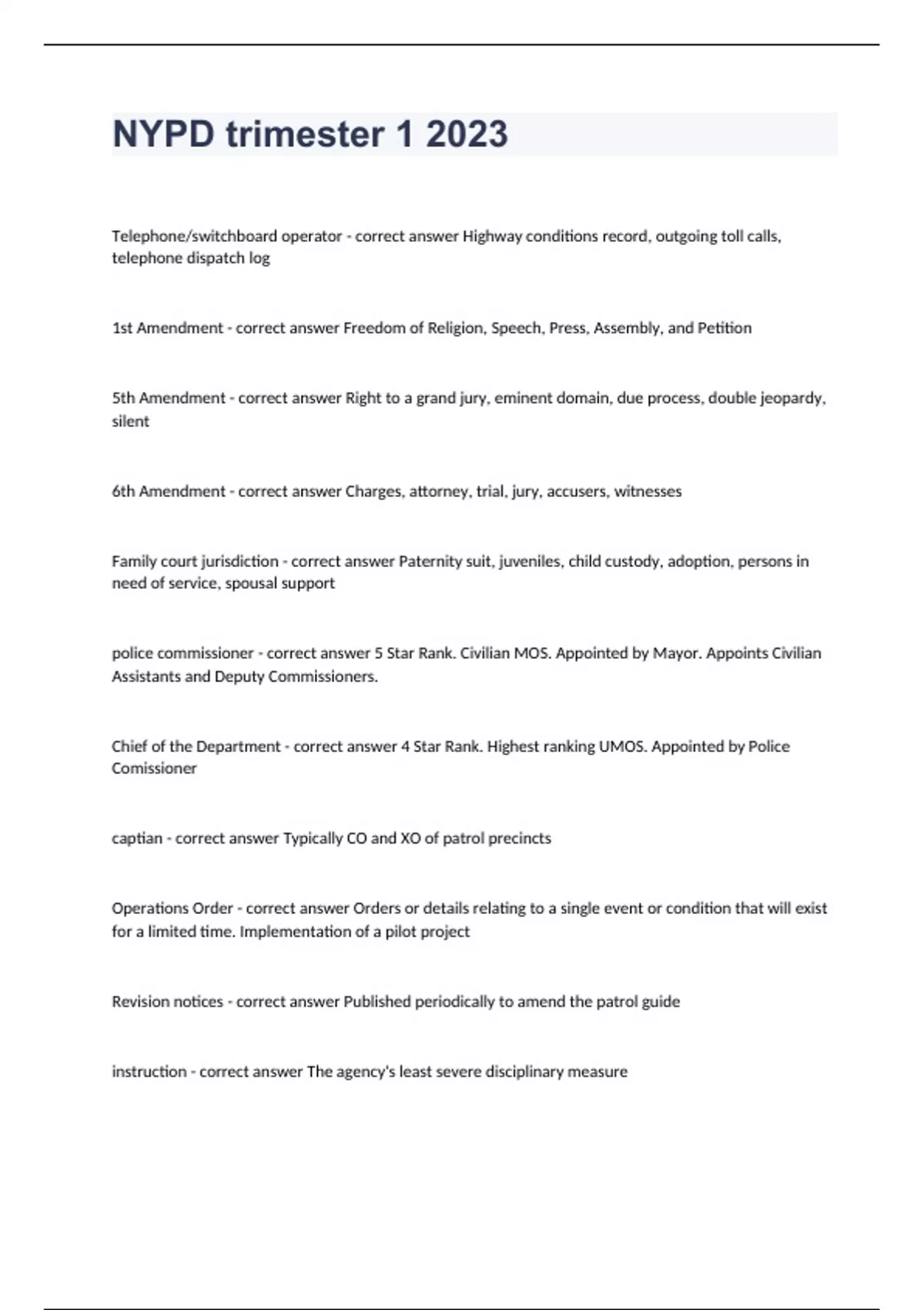 Telephone/switchboard operator - correct answer Highway conditions record, outgoing toll calls, telephone dispatch log 1st Amendment - correct answer Freedom of Religion, Speech, Press, Assembly, and Petition 5th Amendment - correct answer Right to a grand jury, eminent domain, due process, double jeopardy, silent 6th Amendment - correct answer Charges, attorney, trial, jury, accusers, witnesses Family court jurisdiction - correct answer Paternity suit, juveniles, child custody, adoption, persons in need of service, spousal support police commissioner - correct answer 5 Star Rank. Civilian MOS. Appointed by Mayor. Appoints Civilian Assistants and Deputy Commissioners. Chief of the Department - correct answer 4 Star Rank. Highest ranking UMOS. Appointed by Police Comissioner captian - correct answer Typically CO and XO of patrol precincts Operations Order - correct answer Orders or details relating to a single event or condition that will exist for a limited time. Implementation of a pilot project Revision notices - correct answer Published periodically to amend the patrol guide instruction - correct answer The agency's least severe disciplinary measure