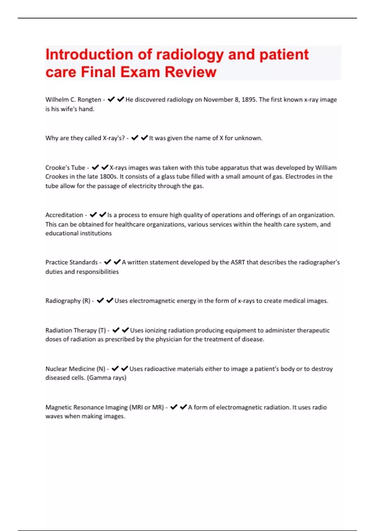 Wilhelm C. Rongten - He discovered radiology on November 8, 1895. The first known x-ray image is his wife's hand. Why are they called X-ray's? - It was given the name of X for unknown. Crooke's Tube - X-rays images was taken with this tube apparatus that was developed by William Crookes in the late 1800s. It consists of a glass tube filled with a small amount of gas. Electrodes in the tube allow for the passage of electricity through the gas. Accreditation - Is a process to ensure high quality of operations and offerings of an organization. This can be obtained for healthcare organizations, various services within the health care system, and educational institutions Practice Standards - A written statement developed by the ASRT that describes the radiographer's duties and responsibilities Radiography (R) - Uses electromagnetic energy in the form of x-rays to create medical images. Radiation Therapy (T) - Uses ionizing radiation producing equipment to administer therapeutic doses of radiation as prescribed by the physician for the treatment of disease. Nuclear Medicine (N) - Uses radioactive materials either to image a patient's body or to destroy diseased cells. (Gamma rays) Magnetic Resonance Imaging (MRI or MR) - A form of electromagnetic radiation. It uses radio waves when making images.Sonography (S) - This is a mechanical energy, this is not ionizing. It's transmitted through matter and the image of the returning sound waves are creating diagnostic images. Nonverbal communication - Paralanguage Body Language Touch Professional Appearance Physical Presence Visual Contact Personal Hygiene Five Stages of Grief - Denial Anger Bargaining Depression Acceptance Objective Data Collection - Are perceptible to the senses, such as signs that can be seen, heard, or felt and vital signs.