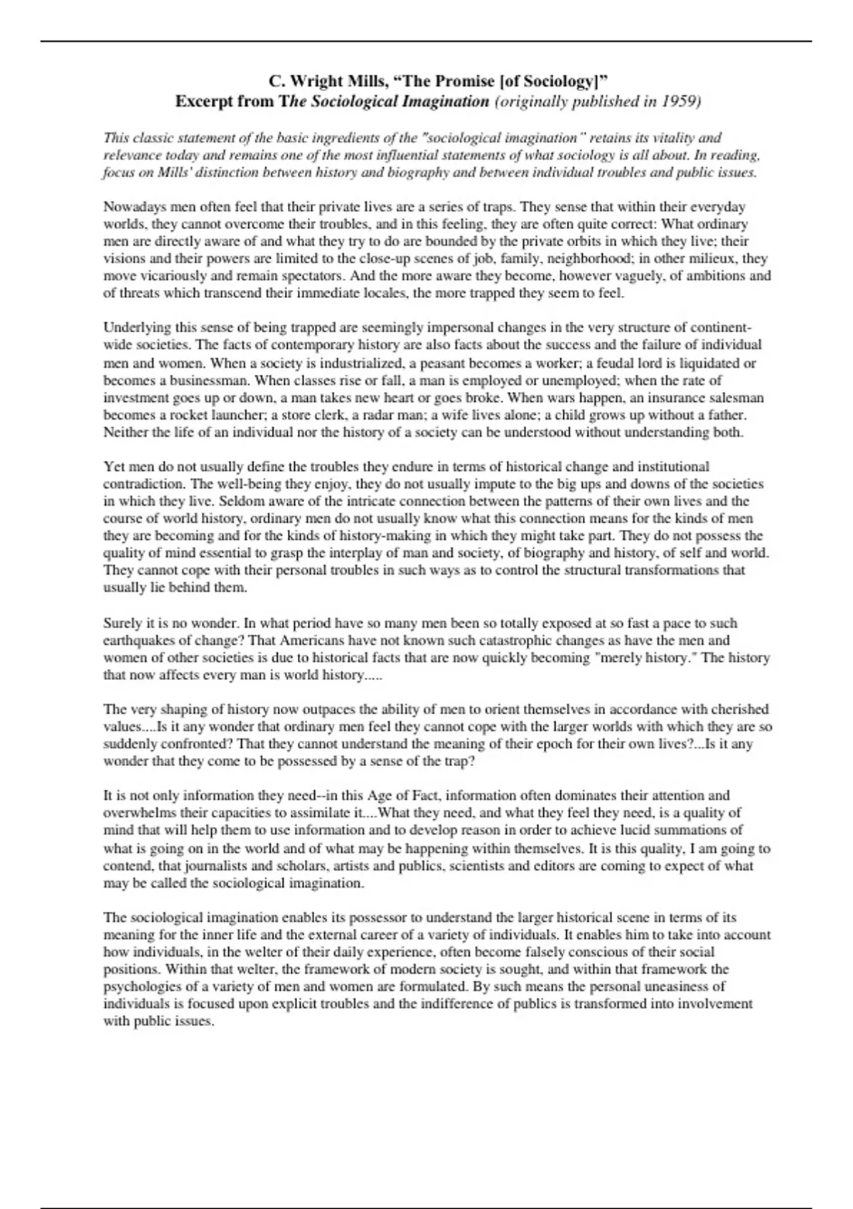 Summary sociology Mills reading