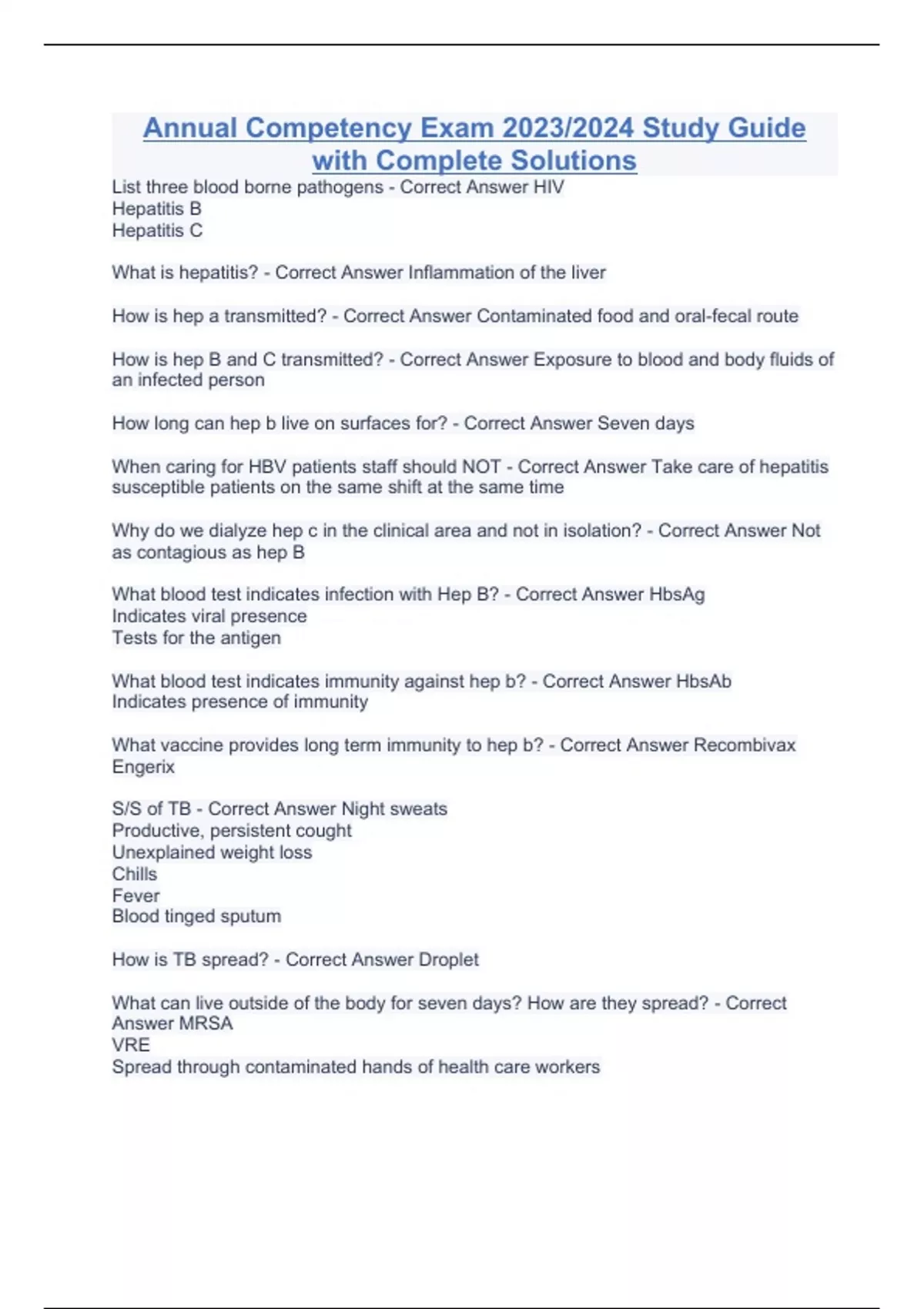 List three blood borne pathogens - Correct Answer HIV Hepatitis B Hepatitis C What is hepatitis? - Correct Answer Inflammation of the liver How is hep a transmitted? - Correct Answer Contaminated food and oral-fecal route How is hep B and C transmitted? - Correct Answer Exposure to blood and body fluids of an infected person How long can hep b live on surfaces for? - Correct Answer Seven days When caring for HBV patients staff should NOT - Correct Answer Take care of hepatitis susceptible patients on the same shift at the same time Why do we dialyze hep c in the clinical area and not in isolation? - Correct Answer Not as contagious as hep B What blood test indicates infection with Hep B? - Correct Answer HbsAg Indicates viral presence Tests for the antigen What blood test indicates immunity against hep b? - Correct Answer HbsAb Indicates presence of immunity What vaccine provides long term immunity to hep b? - Correct Answer Recombivax Engerix S/S of TB - Correct Answer Night sweats Productive, persistent cought Unexplained weight loss Chills Fever Blood tinged sputum How is TB spread? - Correct Answer Droplet What can live outside of the body for seven days? How are they spread? - Correct Answer MRSA VRE Spread through contaminated hands of health care workers