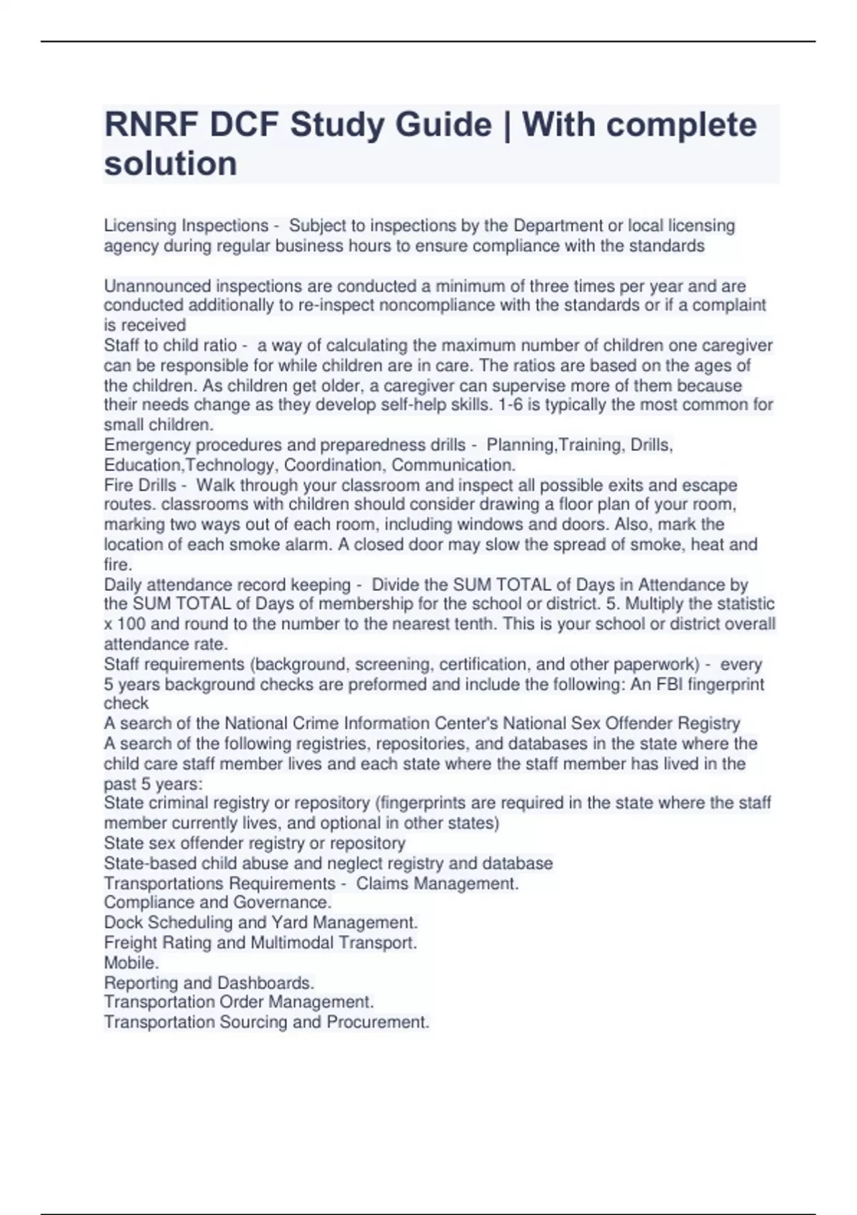 RNRF DCF Study Guide | With complete solution Licensing Inspections - Subject to inspections by the Department or local licensing agency during regular business hours to ensure compliance with the standards Unannounced inspections are conducted a minimum of three times per year and are conducted additionally to re-inspect noncompliance with the standards or if a complaint is received Staff to child ratio - a way of calculating the maximum number of children one caregiver can be responsible for while children are in care. The ratios are based on the ages of the children. As children get older, a caregiver can supervise more of them because their needs change as they develop self-help skills. 1-6 is typically the most common for small children. Emergency procedures and preparedness drills - Planning,Training, Drills, Education,Technology, Coordination, Communication. Fire Drills - Walk through your classroom and inspect all possible exits and escape routes. classrooms with children should consider drawing a floor plan of your room, marking two ways out of each room, including windows and doors. Also, mark the location of each smoke alarm. A closed door may slow the spread of smoke, heat and fire. Daily attendance record keeping - Divide the SUM TOTAL of Days in Attendance by the SUM TOTAL of Days of membership for the school or district. 5. Multiply the statistic x 100 and round to the number to the nearest tenth. This is your school or district overall attendance rate. Staff requirements (background, screening, certification, and other paperwork) - every 5 years background checks are preformed and include the following: An FBI fingerprint check A search of the National Crime Information Center's National Sex Offender Registry A search of the following registries, repositories, and databases in the state where the child care staff member lives and each state where the staff member has lived in the past 5 years: State criminal registry or repository (fingerprints are required in the state where the staff member currently lives, and optional in other states) State sex offender registry or repository State-based child abuse and neglect registry and database Transportations Requirements - Claims Management. Compliance and Governance. Dock Scheduling and Yard Management. Freight Rating and Multimodal Transport. Mobile. Reporting and Dashboards. Transportation Order Management. Transportation Sourcing and Procurement. Driver Requirements - -qualified driver shortage -commercial drivers licences -stringent rules on drug and alcohol abuse Transportation Log - -Kept for 12 months. -Each Child's name. -Date and Time of Departure and Arrival. -Signatures of Driver and Second Staff Member. Vehicle Requirements - -Valid Inspection Sticker - [Valid Registration] -Valid Insurance Card -Nothing blocking examiner from reaching parking or foot brake -Test taker must have a permit and supervising driver -Can the car be a manual transmission? YES! (Driver must display proper shifting) Procedures for administrating medication and isolating contagious children - There are three categories of Transmission-Based Precautions: Contact Precautions, Droplet Precautions, and Airborne Precautions. Medical authorization must include - The core elements of a valid authorization include: A meaningful description of the information to be disclosed. The name of the individual or the name of the person authorized to make the requested disclosure. The name or other identification of the recipient of the information. Guideline for napping - Toddlers (1-2 years): 11-14 hours. Young toddlers may still take two naps, but most drop down to one nap a day by 18 months. Preschool (3-5 years): 10-13 hours. Many preschoolers get enough sleep at night and give up their afternoon nap during these years. Accident/Incident notification must include... - the names and positions of the people involved. the names of any witnesses. the exact location and/or address of the incident. the exact time and date of the occurrence. a detailed and clear description of what exactly happened. a description of the injuries. Square footage requirements - Must have a minimum of 35 square feet of usable indoor floor space for each child unless the facility was continuously licensed with no break in licensure since October 1, 1992, (then 20 square feet per child). Bathroom requirements - Preschool grades through grade three shall be provided with toilet and handwashing facilities located within or adjoining classrooms and such toilet rooms shall be considered adequate without urinals. Common toilet facilities for both sexes shall not be allowed above the third grade. Menus - Start the day with a protein-packed breakfast. Choose foods you know they'll like. Offer new foods all the time. Aim for a 4-week rotating menu cycle. Plan for meal prep time and effort level. Incorporate meals into your lesson plans. Try not to use sweets as a reward. Enlist their help in the kitchen. all legislation and organization pertaining to child care (ADA,94-142, Florida Administrative, Code, licensing) - Family Day Care Home Operators: Must complete 30 hours of department approved training and subsequently pass a competency exam. Additionally, a minimum of 10 hours in-service training is required annually. Appropriate disciplined practice - Show and tell. Teach children right from wrong with calm words and actions. Set limits. Give consequences. Hear them out. Give them your attention. Catch them being good. Know when not to respond. Be prepared for trouble. Information on bathrooms, wash bins, and toilets - he toilets should be designed to minimise hand contact as far as possible for hygienic reasons. Electronic products for toilets such as flush valves and faucets require minimum maintenance but offer enhanced operations that promote sanitation and perceived cleanliness because of hands-free operation. Location of accessible toilets should not be too remote from the main traff