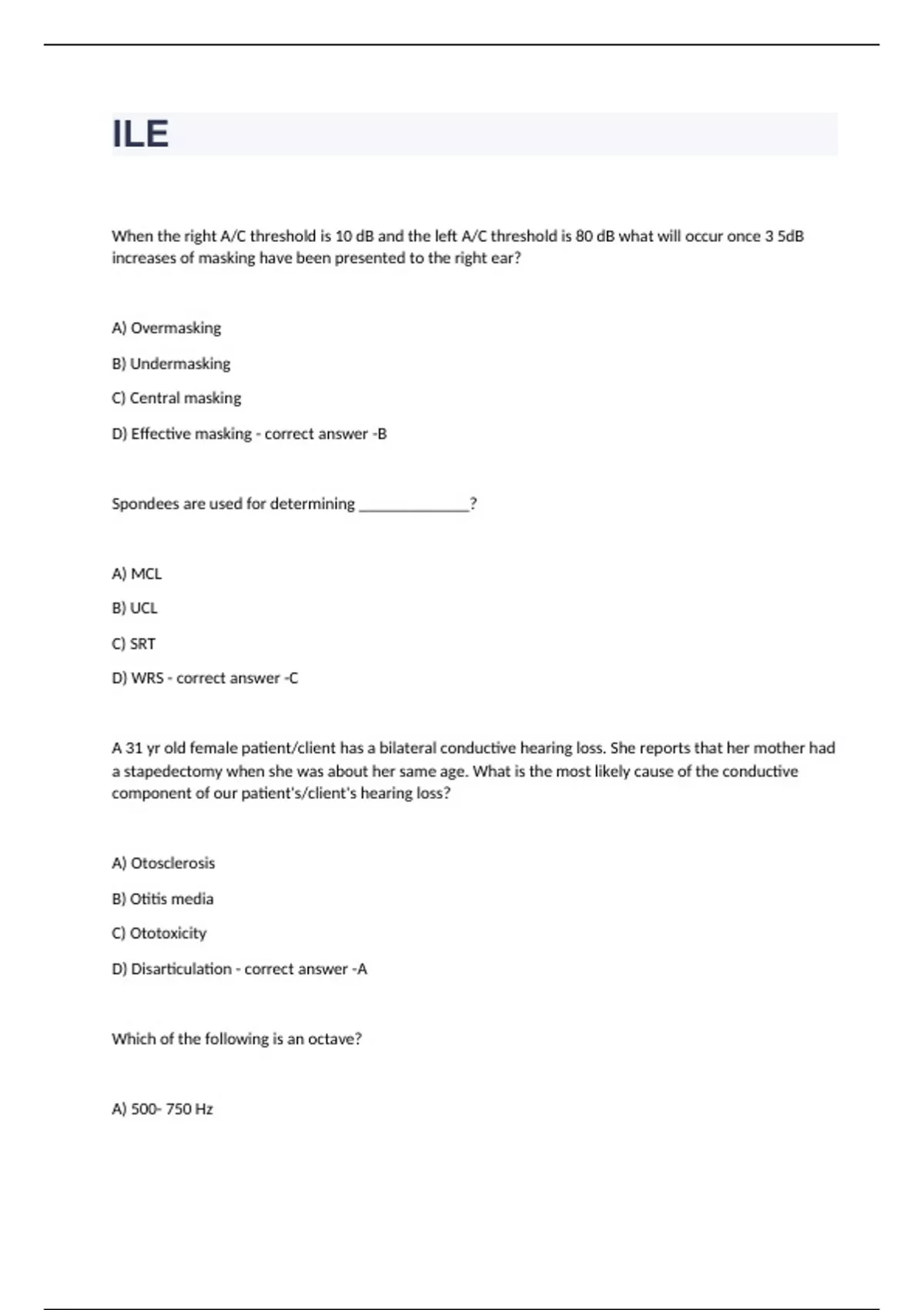 When the right A/C threshold is 10 dB and the left A/C threshold is 80 dB what will occur once 3 5dB increases of masking have been presented to the right ear? A) Overmasking B) Undermasking C) Central masking D) Effective masking - correct answer -B Spondees are used for determining _____________? A) MCL B) UCL C) SRT D) WRS - correct answer -C A 31 yr old female patient/client has a bilateral conductive hearing loss. She reports that her mother had a stapedectomy when she was about her same age. What is the most likely cause of the conductive component of our patient's/client's hearing loss? A) Oto