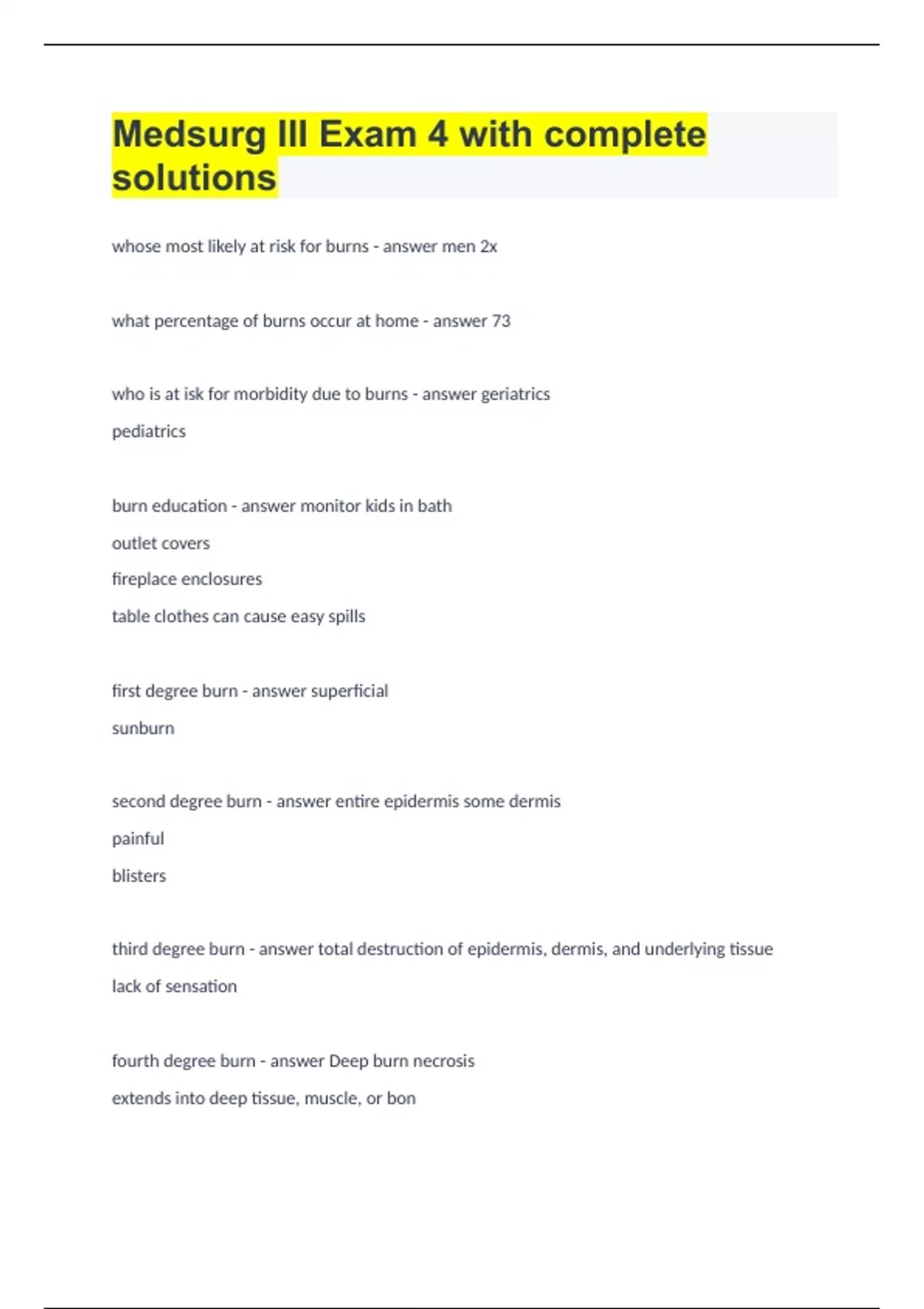 whose most likely at risk for burns men 2x what percentage of burns occur at home 73 who is at isk for morbidity due to burns geriatrics pediatrics burn education monitor kids in bath outlet covers fireplace enclosures table clothes can cause easy spills first degree burn superficial sunburn second degree burn entire epidermis some dermis painful blisters third degree burn total destruction of epidermis, dermis, and underlying tissue lack of sensation fourth degree burn Deep burn necrosis extends into deep tissue, muscle, or bon Injuries that affect >20% ofTBSA are considered severe describe the placement and percentage of the rule of nines Head 9% anterior trunk 18% posterior trunk 18% genitalia 1% arms 9% legs 18% effects of major burns face neck upper extremity burns : inhalation of smoke / heat electrolyte shifts what test assess carbon monoxide poisoning carboxyhemoglobin whats CM of carbon monoxide poisoning fever headache dizzy NV bright pink lips "sut" black sputum Emergent or resuscitativephase onset of injury - fluid resuscitation how to ensure a patent airway in burn victim give humidified 100% O2 Acute or intermediate phase beginning or diuresis - wound closure 48-72 Management of shock: maintain BP, urine output 30-50mL, maintain serum sodium Rehabilitation phase wound closure - return to optimal phsyical / psychosocial what type of burn can cause hematuria electrical what must be continuously assessed in but pt continuously assess airway breathing what electrolytes are shifted in burn pt hyerkalemia -initial hyponatremia -later metabolic acidosis Elevated hematocrit -initial Decrease platelets and increased clotting time -initial What fluid resuscitation should be used for thermal or chemical burns 2mL LR /kg/% TBSA (only 2nd 3rd 4th degree burns) What fluid resuscitation should be used for electrical burns 4mL LR / kg/ %TBSA (only 2nd 3rd 4th degree burns) how are the infusions regulated on burn pts 1/2 of the vol within 8 hours of injury (injury time NOT who they got to hospital) rest within 16hours of injury How often must the patient' s response to fluid therapy be evaluated q1hr what topical agents are used in burn pt silvadine antibiotic ointment explain how the dressing should be applied to burn pt wrap each phalange single and then all together dont wrap tight what burns need graphs deep partial full thickness (decreases risk of infection, prevent further loss of protein fluid electrolytes) whats an Autograft ideal graph from pts own skin Homograft donated skin from deceased or living Xenograft skin from animals - usually a pig how long should the dressings be on the new graph until change? 3-5 days burn pt edu for prevention of infection limited visitors - may need full PPE no fresh fruit and flowers sterile procedures tubes /lines are only ok for 24hours - then need change whats the number 1 route for pain relief in burn pt IV Morphine & Fentanyl are commonly used in burn pt, what needs to be monitored respiratory and constipation A client with a superficial partial-thickness solar burn (sunburn)of the chest, back, face, and arms is seen in urgent care. Thenurse's primary concern should be pain management when should nutrition be administered to burn pt ASAP high protein high cal pt not eating well : ask what you like to eat nursing implementations for Psychosocial Support talk to how they feel promote body image talk to patient during dressing changes follow up care for burn pts early ambulation (prevent pneumonia and DVT) have family pt demonstrate wound care compression garments/wraps promotes circulation pain meds q 30 mins intact blisters average time between HIV + test and AIDS is 8-10 years period from infection of HIV and development of HIV antibodies for 3 months what cells does HIV target CD4 Reverse Transcriptase changes RNA to DNA who is at risk for HIV breastfed infants or birth of HIV+ mom Bisexual men IV drug users what edu should be given for prevention of HIV condoms needle exchange behavioral interventions avoid sharing needles antiviral medications within 72hours of exposure (2-3 rx for 28 days) if an RN has a needle stick, what should they do first inform their manager Antiretroviral medications aspostexposure prophylaxis forhealth care workers arestarted within how manyhours of exposure? 72 stage 0 HIV early HIV stage 1 of HIV Primary/acute Period from infection with HIV to the development of HIV-specific antibodies CD4+ T-cell counts normally 500 to1500 cells/mm3 of blood how many stages of HIV are there 5 Stage 2 HIV t lymphocytes between 200-499 Stage 3 HIV CD4 count below 200 cells considered to have AIDS stage unknown HIV no info on CD4 count how do we treat immune Reconstitution InflammatorySyndrome (IRIS) in HIV pt's steroids Kaposi's Sarcoma cancer caused by herpes virus TX: antibiotic or anti-tumor therapy (usually daunorubicin) what to monitor w pt on daunorubicin monitor liver labs so if liver enzymes are high: we cut dose in half CM of HIV asymptomatic in stage 1 or skin rash SOB dyspnea chest pain cough TB pneumonia NV anorexia dirrhea oral candidiasis