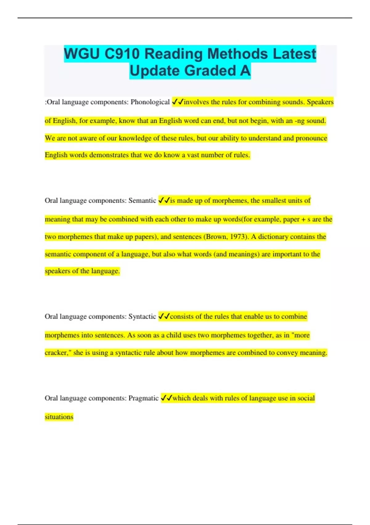WGU C910 Reading Methods Latest Update Graded A :Oral language components: Phonological involves the rules for combining sounds. Speakers of English, for example, know that an English word can end, but not begin, with an -ng sound. We are not aware of our knowledge of these rules, but our ability to understand and pronounce English words demonstrates that we do know a vast number of rules. Oral language components: Semantic is made up of morphemes, the smallest units of meaning that may be combined with each other to make up words(for example, paper + s are the two morphemes that make up papers), and sentences (Brown, 1973). A dictionary contains the semantic component of a language, but also what words (and meanings) are important to the speakers of the language. Oral language components: Syntactic consists of the rules that enable us to combine morphemes into sentences. As soon as a child uses two morphemes together, as in "more cracker," she is using a syntactic rule about how morphemes are combined to convey meaning. Oral language components: Pragmatic which deals with rules of language use in social situations reciprocal teaching A strategy in which students take on an instructional role in a small group where they take on role such as questioning, clarifying, predicting, or summarizing Think-pair-share Comprehension strategy in which students collaborate with a partner to discuss a topic, answer a question, or share ideas. graphic organizer A tool that allows a reader to focus on the relationship between concepts in a text. Anticipation guided A pre-reading activity in which students respond to a series of statements about a topic about which they will soon read. It builds curiosity about a topic and helps to establish a purpose for reading. Important factor included in Gradual Release of responsibility: scaffolding Prosody inotation, stress and phrasing included in fluency Repeated oral readings are most effective when text is slightly challenging teacher generated questions are NOT a mature comprehension strategy, TRUE OR FALSE true they are not good for mature readers Reading Workshops During reading workshop students are involved in a variety of authentic reading activities. The workshop might include whole group strategy demonstration, conferring with the teacher individually or in a small group, and reading teacher-selected and self-selected texts at an appropriate level. These opportunities provide time for students to practice applying a reading skill or strategy the teacher has demonstrated. Teacher sharing time, mini-lessons, self-selected reading and response, and students sharing time are four main components of... reading workshop Running records are 'records of oral reading' so the teacher sits next to the child and documents the child's reading behaviors. Book talk when a teacher presents a book to students with the purpose of persuading them to choose that book to read ex: A 4th grade teacher is setting up literature circles and chooses five books the students may choose to read. She enthusiastically provides information on each book which includes the type of genre, a brief overview of the book, and reading of a favorite section. This activity is referred to as.. Tier 1 instruction of RTI (general education) relates to the high-quality instruction all student much participate in with their regular classroom teachers All children start in Tier 1, which consists of a research-based core curriculum Tier 2 instruction of RTI (early intervening services) consists of increasing time and intensity of instruction in specific elements of the core curriculum for children who do not appear to be responding appropriately to Tier 1 instruction Tier 2 consists of increasing the time and intensity of the child's exposure to the core curriculum for children who do not appear to be responding appropriately to Tier 1 instruction Tier 3 instruction of RTI (intensive intervention) Tier 3 is intensive intervention for students who have not responded to Tier 1 or Tier 2 instruction students are given long-term intensive literacy support that targets their skill deficits Tier 3 includes long-term support for students. Some of the students may be eligible for special education and related services, and other will not. DIBELS includes ALL of the following assessments which allow teachers to examine students' abilities in: 1. recognizing initial sounds (phonemic awareness) 2. segmenting words into phonemes (phonemic awareness) 3. naming the letters of the alphabet (alphabetic principle) 4. reading nonsense words (alphabetic principle) 5. orally reading of a passage (accuracy and fluency) 6. retelling (comprehension) DIBELS Dynamic Indicators of Basic Early Literacy Skills classroom climate The teacher creates an environment in which students have time to read, opportunities to share about their reading, and are encouraged to demonstrate support and respect for others' perspectives and their own. Print-rich environment The teacher builds a classroom environment that includes a variety of books with varying levels, topics, cultural backgrounds, and genres. This also includes student-created writing and charts that are co-created by the teacher and students. choice The teacher provides a writing center with a variety of options the students can use to respond to literature they've read. modeling The teacher sits and reads his own book during the students' independent reading time. Regardless of reading level, during all small group instruction students should... read from a leveled reader: reading from a leveled reader is a crucial aspect for all students in small group instruction Reading intervention for English Language Learners... should have a strong emphasis on vocabulary One way to reduce isolation of weaker readers is to... have all students reading texts on a common theme Below grade level readers need more time working on DECODING skills so that fluency and comprehension skills incre