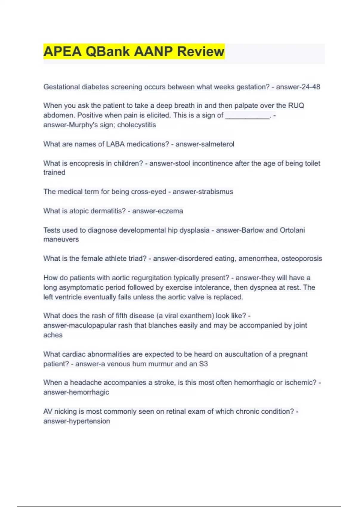 APEA QBank AANP Review exam 2023 correct question and answers/ verified solution Gestational diabetes screening occurs between what weeks gestation? - answer-24-48 When you ask the patient to take a deep breath in and then palpate over the RUQ abdomen. Positive when pain is elicited. This is a sign of ___________. - answer-Murphy's sign; cholecystitis What are names of LABA medications? - answer-salmeterol What is encopresis in children? - answer-stool incontinence after the age of being toilet trained