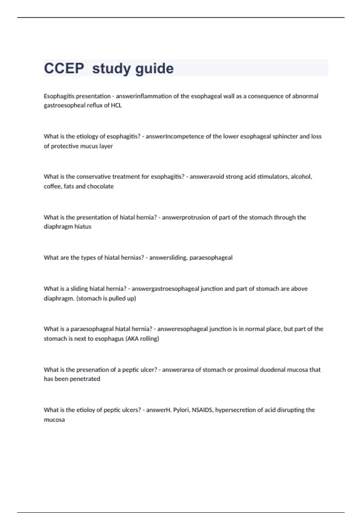 CCEP study guide questions and answers review 2023 Esophagitis presentation inflammation of the esophageal wall as a consequence of abnormal gastroesopheal reflux of HCL What is the etiology of esophagitis? Incompetence of the lower esophageal sphincter and loss of protective mucus layer What is the conservative treatment for esophagitis? avoid strong acid stimulators, alcohol, coffee, fats and chocolate What is the presentation of hiatal hernia? protrusion of part of the stomach through the diaphragm hiatus What are the types of hiatal hernias? sliding, paraesophageal What is a sliding hiatal hernia? gastroesophageal junction and part of stomach are above diaphragm. (stomach is pulled up) What is a paraesophageal hiatal hernia? esophageal junction is in normal place, but part of the stomach is next to esophagus (AKA rolling)