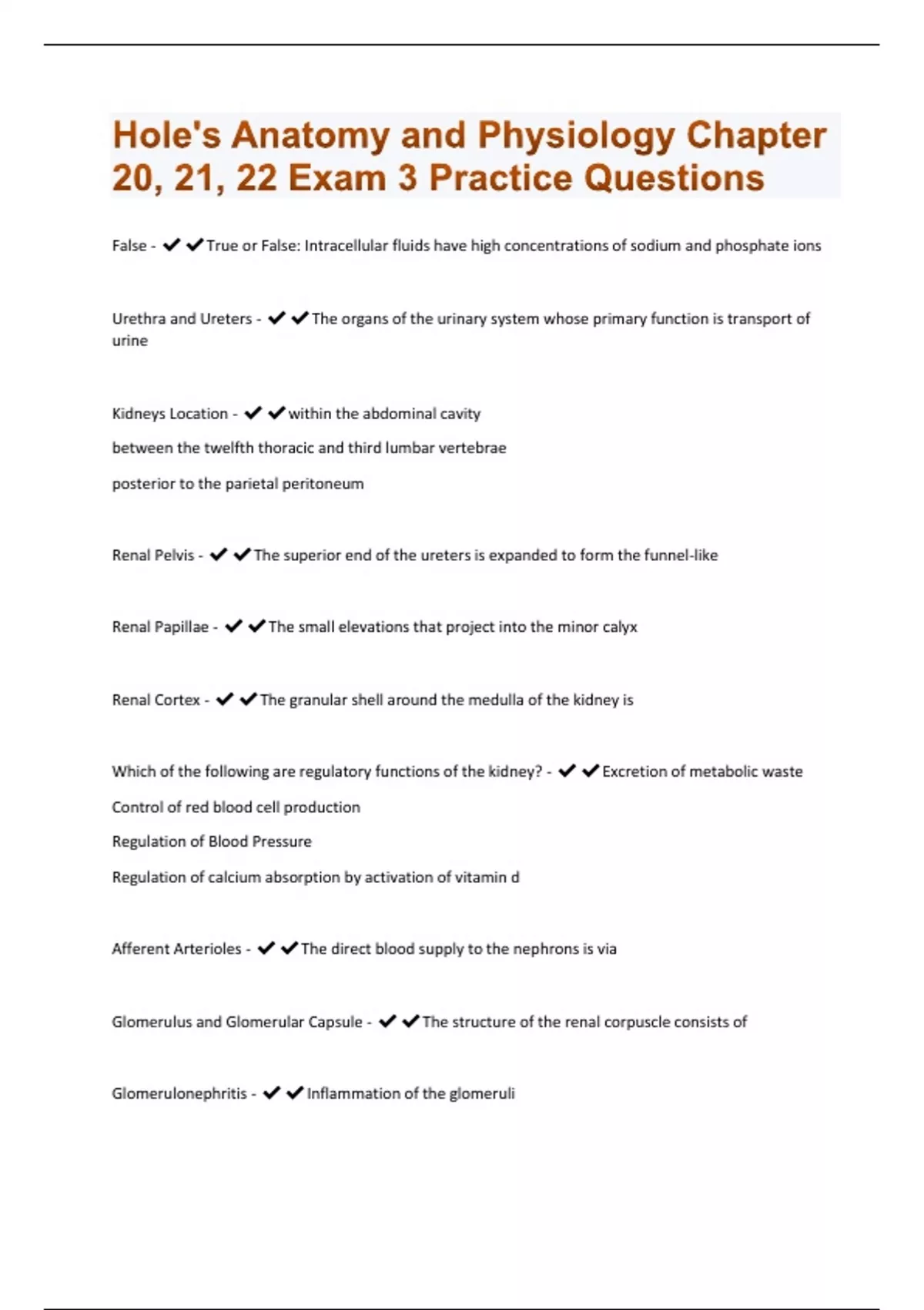 False - True or False: Intracellular fluids have high concentrations of sodium and phosphate ions Urethra and Ureters - The organs of the urinary system whose primary function is transport of urine Kidneys Location - within the abdominal cavity between the twelfth thoracic and third lumbar vertebrae posterior to the parietal peritoneum Renal Pelvis - The superior end of the ureters is expanded to form the funnel-like Renal Papillae - The small elevations that project into the minor calyx Renal Cortex - The granular shell around the medulla of the kidney is Which of the following are regulatory functions of the kidney? - Excretion of metabolic waste Control of red blood cell production Regulation of Blood Pressure Regulation of calcium absorption by activation of vitamin d Afferent Arterioles - The direct blood supply to the nephrons is via Glomerulus and Glomerular Capsule - The structure of the renal corpuscle consists of Glomerulonephritis - Inflammation of the glomeruliEfferent Arteriole - Blood leaves the capillary cluster of the renal corpuscle via Inferior Vena Cava - The renal vein carries blood from the kidney and returns blood to the general circulation via Collecting Duct - the distal convoluted tubule empties urine into this structure Macula Densa - The tall, densely packed cells at the end of the nephron loop that regulate glomerular filtration rate The small diameter of the efferent arteriole in comparison with the afferent arteriole - The relatively high pressure in the glomerulus is due to Renal Medulla - Renal pyramids are located in the Aldosterone - High angiotensin, low sodium and low blood pressure should increase production of Increased Glomerular hydrostatic pressure - Causes increase in glomerular filtration rate Glomerulus - In the kidney, initial filtrate is made by Minor calyx - Immediately after leaving the collecting duct urine is first captured by Angiotensinogen to angiotensin - Renin catalyzes the conversion of Water; posterior pituitary gland - ADH helps retain ___ and is secreted from ___Micturition - Process of releasing urine to the outside