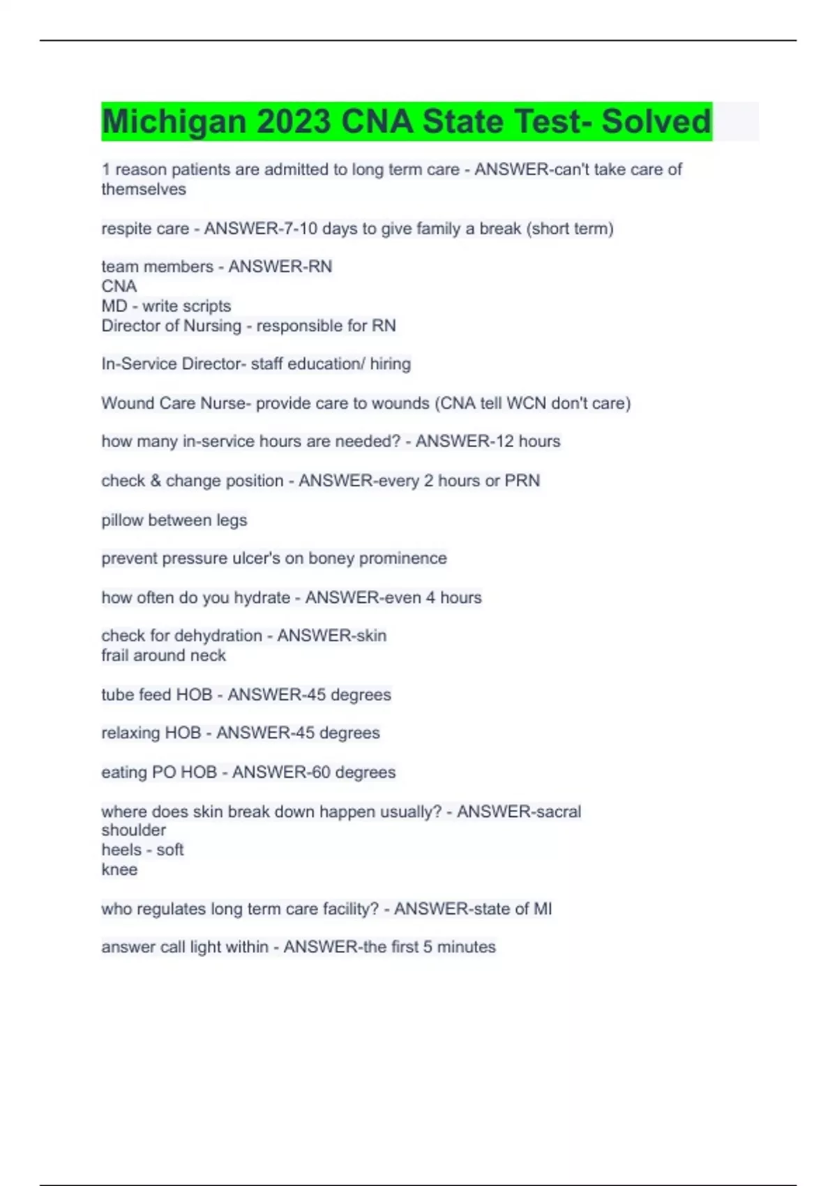 1 reason patients are admitted to long term care - ANSWER-can't take care of themselves respite care - ANSWER-7-10 days to give family a break (short term) team members - ANSWER-RN CNA MD - write scripts Director of Nursing - responsible for RN In-Service Director- staff education/ hiring Wound Care Nurse- provide care to wounds (CNA tell WCN don't care) how many in-service hours are needed? - ANSWER-12 hours check & change position - ANSWER-every 2 hours or PRN pillow between legs prevent pressure ulcer's on boney prominence how often do you hydrate - ANSWER-even 4 hours check for dehydration - ANSWER-skin frail around neck tube feed HOB - ANSWER-45 degrees relaxing HOB - ANSWER-45 degrees eating PO HOB - ANSWER-60 degrees where does skin break down happen usually? - ANSWER-sacral shoulder heels - soft knee who regulates long term care facility? - ANSWER-state of MI answer call light within - ANSWER-the first 5 minutes how often do you hydrate a comatose patient? - ANSWER-every 4 hours with swab - inside of mouth/ lips w/ chapstick can residents leave room without socks/ shoes? - ANSWER-no, they must have them safety & dignity citations are possible if.. - ANSWER-CNA isn't able to get to where they need to be (caught up with something else) if a resident falls... - ANSWER-notify RN don't move them make sure they're safe levels of alertness & orientation - ANSWER-A&O x1 = name only A&O x2 = name & few questions A&O x3 = name, where they are & what year it is continent status - ANSWER-if they know they can go to bathroom or not 5 things you MUST do even time you enter - ANSWER-knock introduce self/ greet resident explain why you're there provide privacy (curtain) wash hands - before & after care indirect care - ANSWER-Comfort Safety Residents rights most common residents in long term care - ANSWER-dementia diabetes age range of patients in long term care - ANSWER-no age range just people who require 24 hr care septicemia - ANSWER-blood infection (dirty blood) first sign: fever/ unresponsiveness ostomy - ANSWER-opening