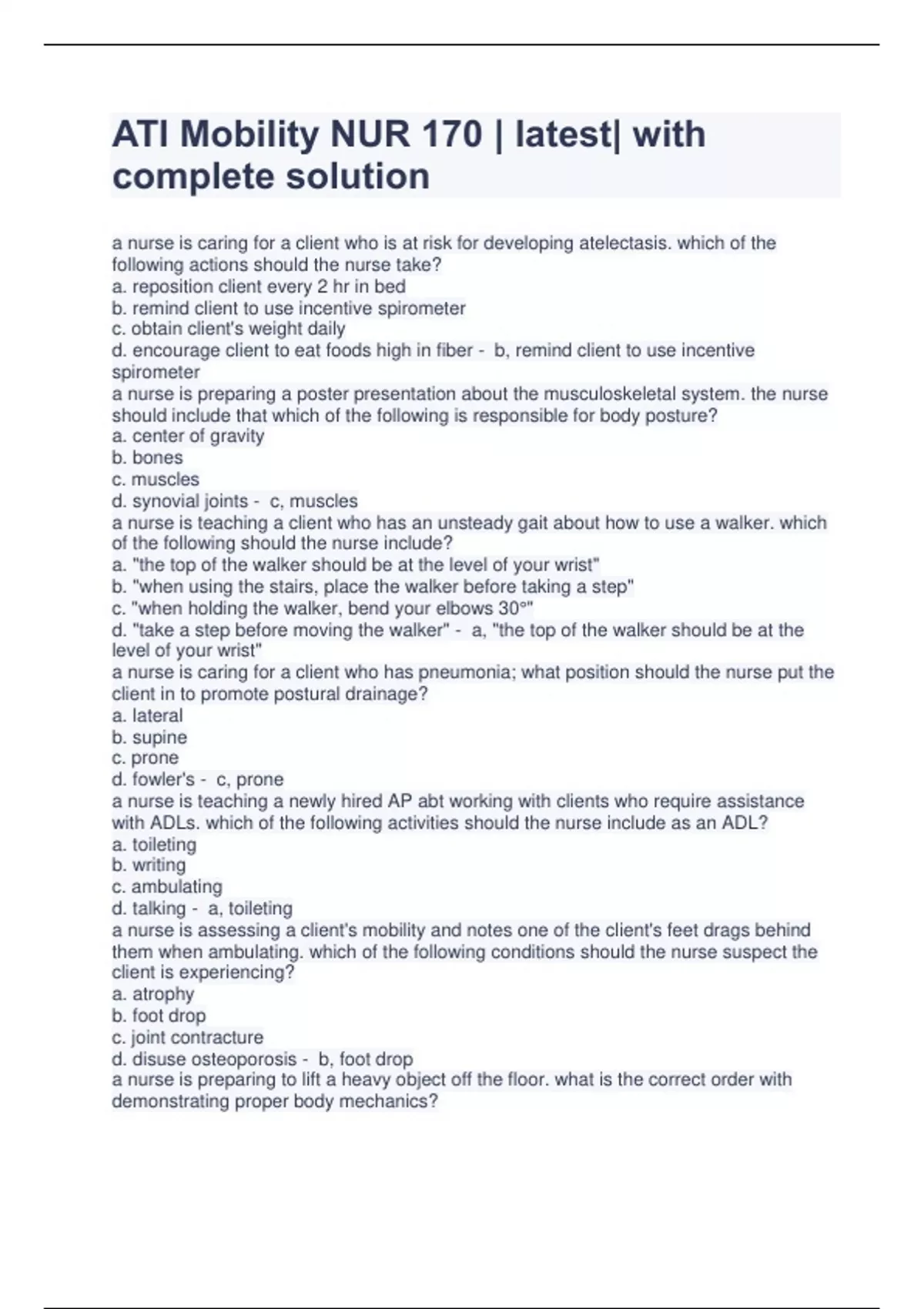 ATI Mobility NUR 170 | latest| with complete solution a nurse is caring for a client who is at risk for developing atelectasis. which of the following actions should the nurse take? a. reposition client every 2 hr in bed b. remind client to use incentive spirometer c. obtain client's weight daily d. encourage client to eat foods high in fiber - b, remind client to use incentive spirometer a nurse is preparing a poster presentation about the musculoskeletal system. the nurse should include that which of the following is responsible for body posture? a. center of gravity b. bones c. muscles d. synovial joints - c, muscles a nurse is teaching a client who has an unsteady gait about how to use a walker. which of the following should the nurse include? a. "the top of the walker should be at the level of your wrist" b. "when using the stairs, place the walker before taking a step" c. "when holding the walker, bend your elbows 30°" d. "take a step before moving the walker" - a, "the top of the walker should be at the level of your wrist" a nurse is caring for a client who has pneumonia; what position should the nurse put the client in to promote postural drainage? a. lateral b. supine c. prone d. fowler's - c, prone a nurse is teaching a newly hired AP abt working with clients who require assistance with ADLs. which of the following activities should the nurse include as an ADL? a. toileting b. writing c. ambulating d. talking - a, toileting a nurse is assessing a client's mobility and notes one of the client's feet drags behind them when ambulating. which of the following conditions should the nurse suspect the client is experiencing? a. atrophy b. foot drop c. joint contracture d. disuse osteoporosis - b, foot drop a nurse is preparing to lift a heavy object off the floor. what is the correct order with demonstrating proper body mechanics? a. look straight ahead with shoulders raised up b. keep abdominal muscles contracted and lower back straight c. stand as close to the object as possible d. bend hips slightly and squat e. push up from the knees when lifting the object - c, b, a, d, e a nurse is preparing a presentation about muscle function for a group of newly licensed nurses. which should the nurse plan to include? a. muscles store calcium and magnesium b. muscles produce red blood cells and platelets c. muscles assist with thermoregulation in the body d. muscles provide protection of internal organs - c, muscles assist with thermoregulation in the body a nurse is planning care for a client who is post-op. what position should the client be in to avoid atelectasis? a. fowler's b. lateral c. prone d. supine - c, fowler's atelectasis - partial or complete collapsed lung fowler's - semi-sitting position with knees bent or straight a nurse in a long-term care facility is caring for an older adult client and notes their muscles have become smaller and weaker. which of the following should the nurse suspect the client is experiencing? a. sarcopenia b. disuse osteoporosis c. atrophy d. joint contracture - c, atrophy a nurse is performing a skin assessment on a client who has a wound on their heel that is blistered and lighter in color than the client's skin tone. the nurse should identify that the wound is in which of the following stages of damage? a. deep damage through skin and tissue b. damage beyond skin layer c. damage into skin layer d. damage with skin intact - c, damage into skin layer a nurse is discussing proper body mechanics with a group of Abs. which of the following should the nurse include? (all that apply) a. a stable center of gravity increases stability and balance b. a wide base lowers center of gravity c. proper body alignment involves tightening abdomen d. leaning slightly back while carrying an object equalizes center of gravity e. bending at waist when picking up objects stabilizes spine - a, b, c a nurse is caring for a client who requires total assistance with mobility. when using the mobility assessment tool (MAT), which of the following pieces should the nurse use to transfer the client? a. gait belt b. mechanical lift