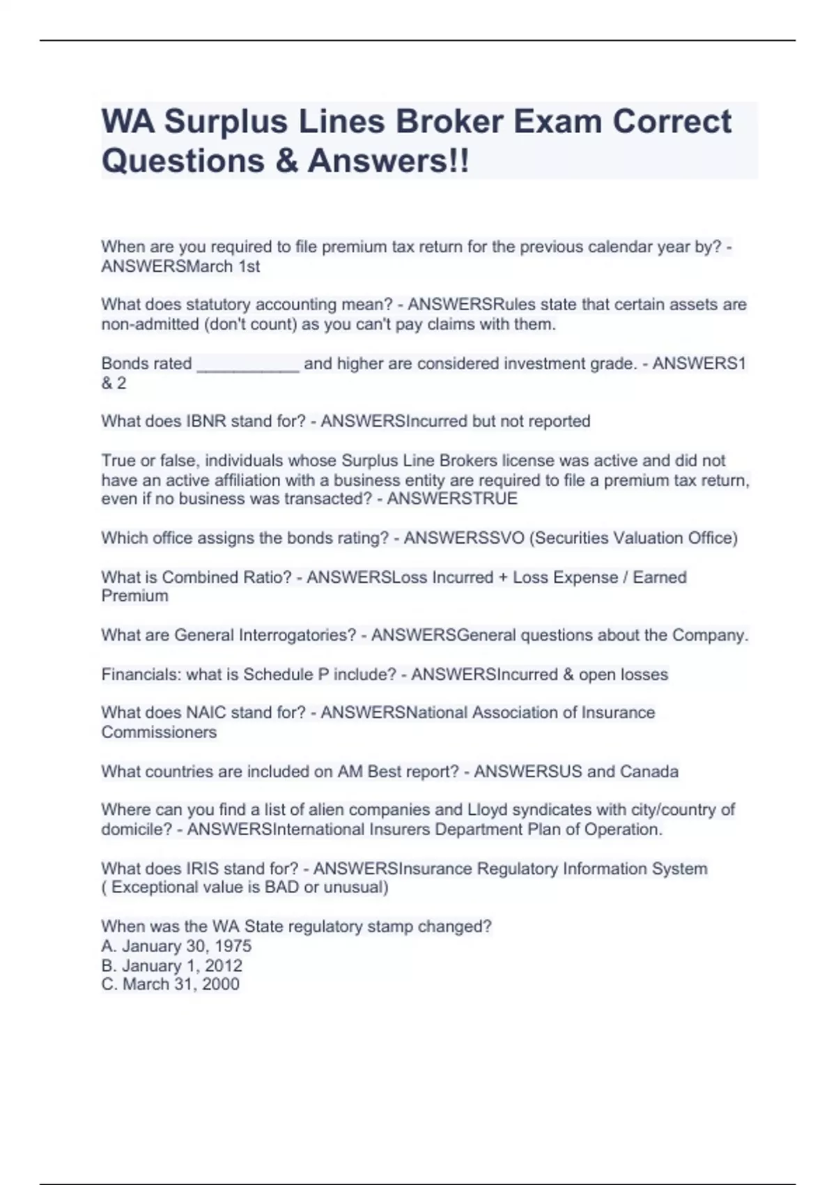 WA Surplus Lines Broker Exam Correct Questions & Answers!!