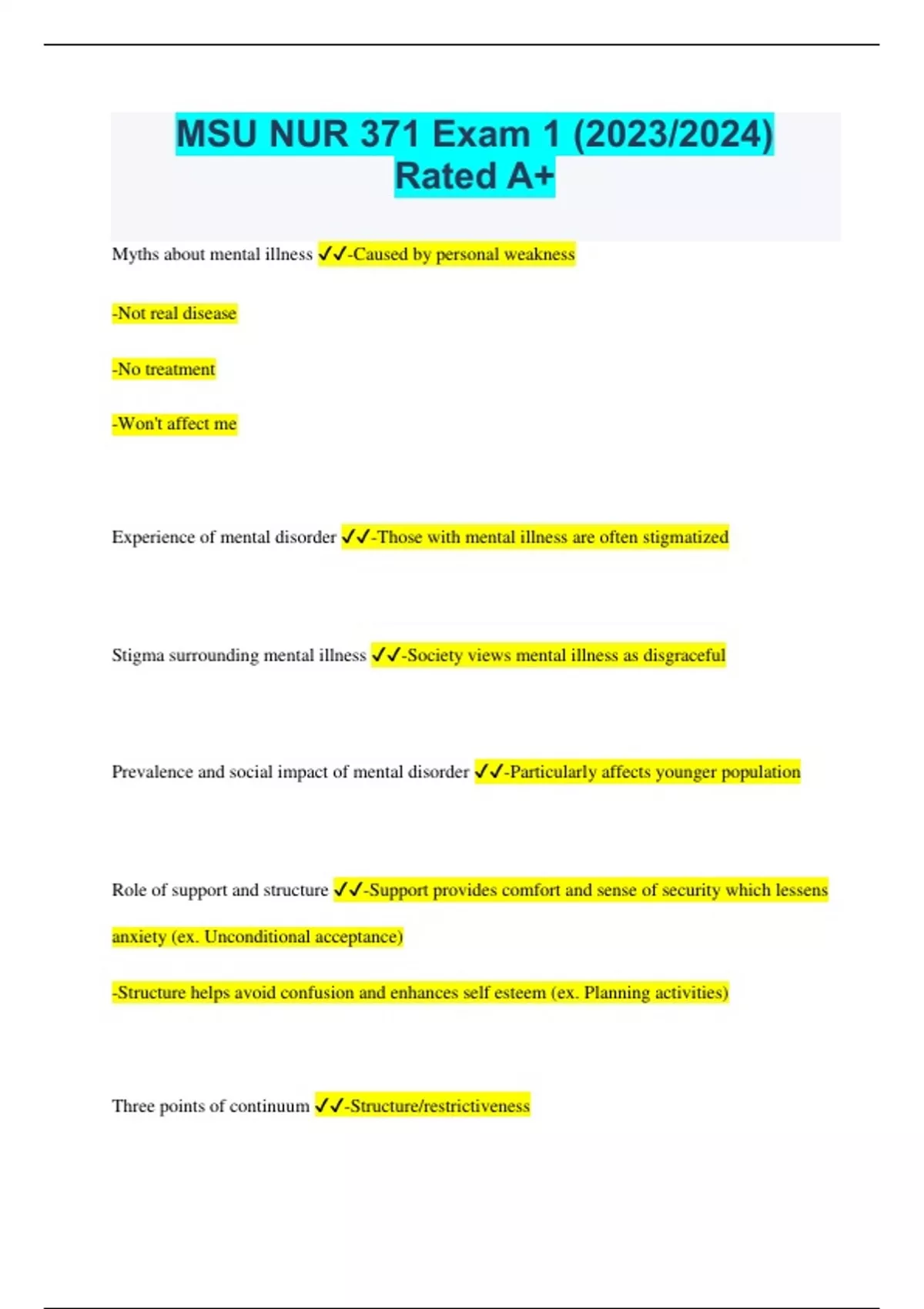 MSU NUR 371 Exam 1 (2023/2024) Rated A+ Myths about mental illness -Caused by personal weakness -Not real disease -No treatment -Won't affect me Experience of mental disorder -Those with mental illness are often stigmatized Stigma surrounding mental illness -Society views mental illness as disgraceful Prevalence and social impact of mental disorder -Particularly affects younger population Role of support and structure -Support provides comfort and sense of security which lessens anxiety (ex. Unconditional acceptance) -Structure helps avoid confusion and enhances self esteem (ex. Planning activities) Three points of continuum -Structure/restrictiveness -Skills orientation -Community integration Continuum of Care Inpatient --> Day Hospital --> Intensive outpatient --> Outpatient --> Residential tx --> ACT Team **Inpatient = MOST structured, most restrictive (institutional) **ACT = least structured, least restrictive (community) Community integration relevance ACT Team --> Outpatient --> Residential --> Inpatient **ACT Team = MOST Skills orientation programs -Club House -Vocational programs -Day treatment -Residential treatment Problems in the mental health service delivery system -Disparities = minorities have less access, poorer quality services -Deinstitutionalization = Decrease in inpatients, however no replacement for community care Role of nursing in psychiatric care -Assess bio-psycho-social -Care planning for both patient and family -Care organization including access and integration of services -Promote health by managing effects of disorder -Milieu