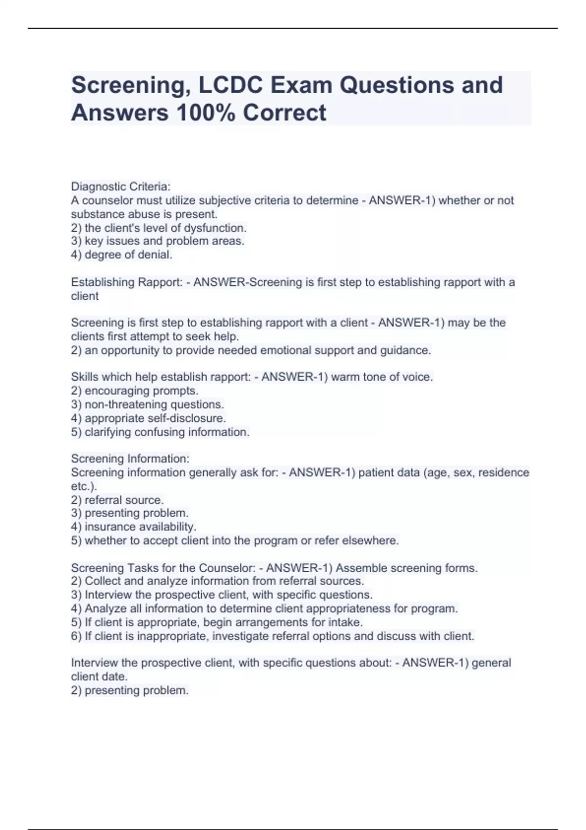 Screening, LCDC Exam Questions and Answers 100% CorrectScreening, LCDC Exam Questions and Answers 100% CorrectScreening, LCDC Exam Questions and Answers 100% Correct Diagnostic Criteria: A counselor must utilize subjective criteria to determine - ANSWER-1) whether or not substance abuse is present. 2) the client's level of dysfunction. 3) key issues and problem areas. 4) degree of denial. Establishing Rapport: - ANSWER-Screening is first step to establishing rapport with a client Screening is first step to establishing rapport with a client - ANSWER-1) may be the clients first attempt to seek help.