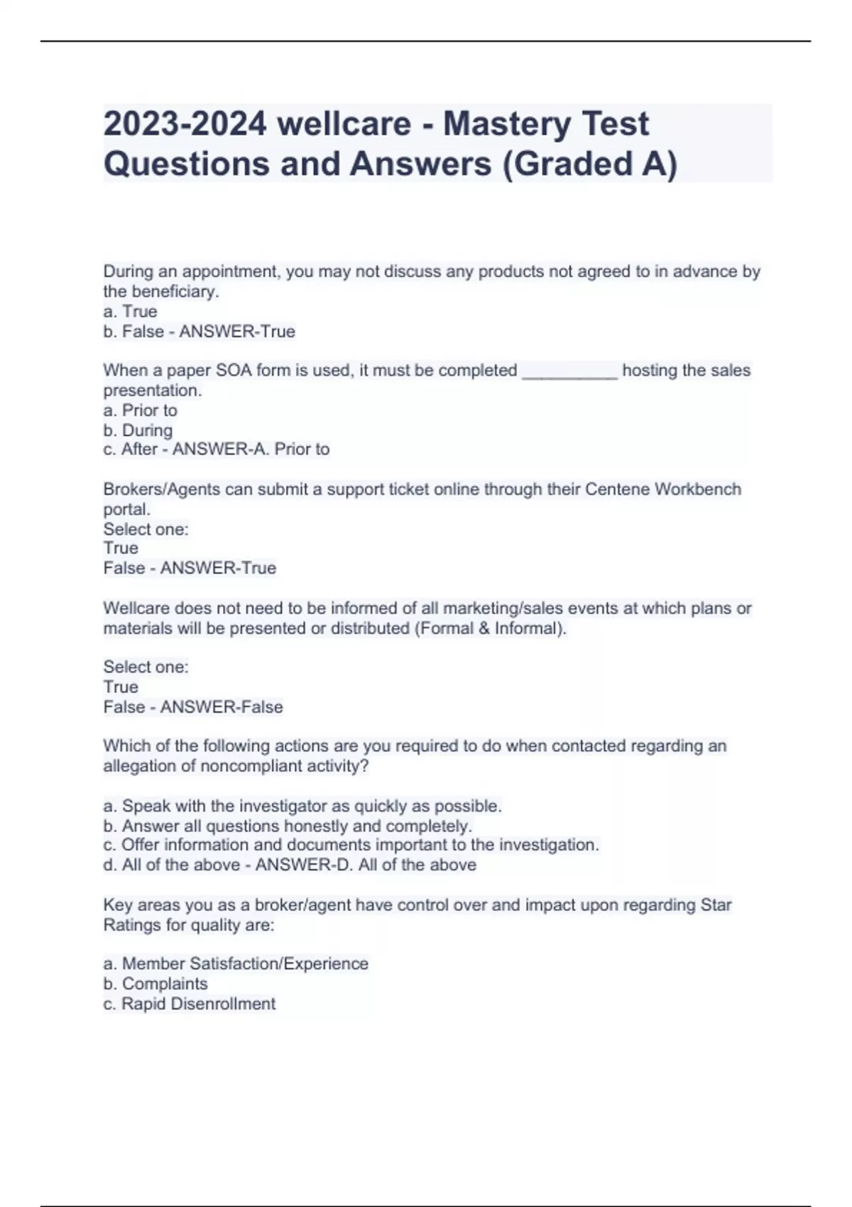 wellcare - Mastery Test Questions and Answers (Graded A) wellcare - Mastery Test Questions and Answers (Graded A) wellcare - Mastery Test Questions and Answers (Graded A) wellcare - Mastery Test Questions and Answers (Graded A) During an appointment, you may not discuss any products not agreed to in advance by the beneficiary. a. True b. False - ANSWER-True When a paper SOA form is used, it must be completed __________ hosting the sales presentation. a. Prior to b. During c. After - ANSWER-A. Prior to Brokers/Agents can submit a support ticket online through their Centene Workbench portal. Select one: True False - ANSWER-True Wellcare does not need to be informed of all marketing/sales events at which plans or materials will be presented or distributed (Formal & Informal). Select one: True False - ANSWER-False