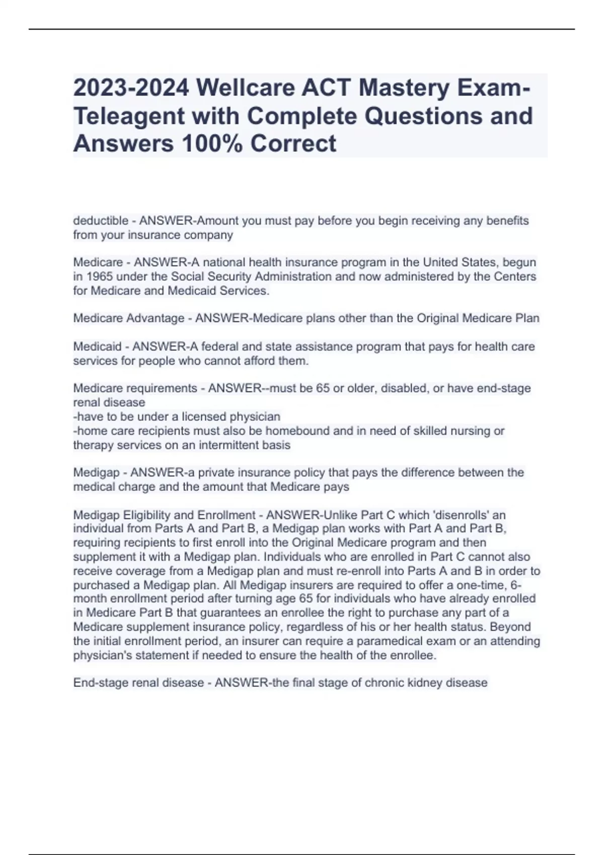 Wellcare ACT Mastery Exam-Teleagent with Complete Questions and Answers 100% Correct Wellcare ACT Mastery Exam-Teleagent with Complete Questions and Answers 100% Correct Wellcare ACT Mastery Exam-Teleagent with Complete Questions and Answers 100% Correctdeductible - ANSWER-Amount you must pay before you begin receiving any benefits from your insurance company Medicare - ANSWER-A national health insurance program in the United States, begun in 1965 under the Social Security Administration and now administered by the Centers for Medicare and Medicaid Services. Medicare Advantage - ANSWER-Medicare plans other than the Original Medicare Plan