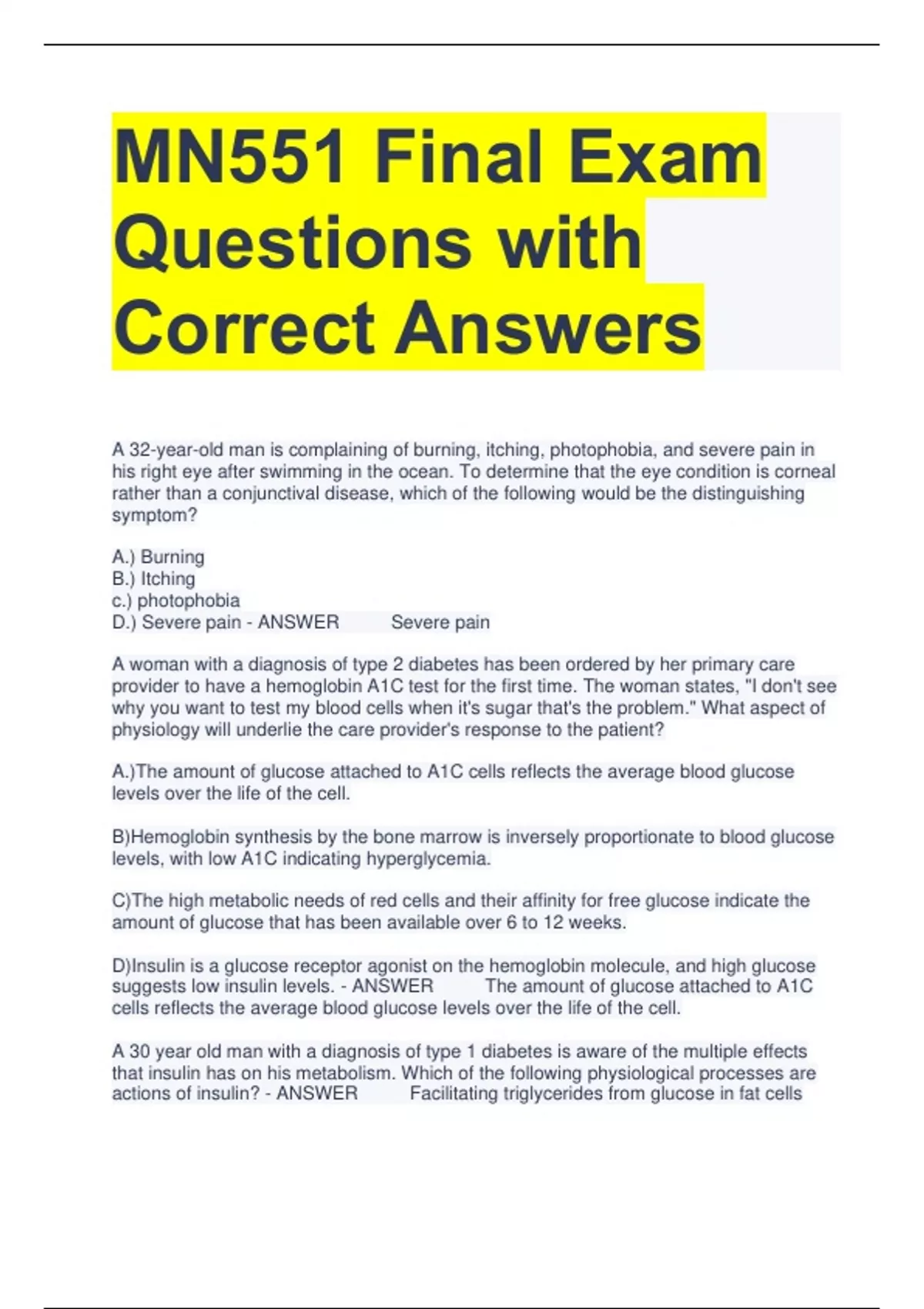 MN551 Final Exam Questions with Correct Answers A 32-year-old man is complaining of burning, itching, photophobia, and severe pain in his right eye after swimming in the ocean. To determine that the eye condition is corneal rather than a conjunctival disease, which of the following would be the distinguishing symptom? A.) Burning B.) Itching c.) photophobia D.) Severe pain - ANSWER Severe pain A woman with a diagnosis of type 2 diabetes has been ordered by her primary care provider to have a hemoglobin A1C test for the first time. The woman states, "I don't see why you want to test my blood cells when it's sugar that's the problem." What aspect of physiology will underlie the care provider's response to the patient? A.)The amount of glucose attached to A1C cells reflects the average blood glucose levels over the life of the cell. B)Hemoglobin synthesis by the bone marrow is inversely proportionate to blood glucose levels, with low A1C indicating hyperglycemia. C)The high metabolic needs of red cells and their affinity for free glucose indicate the amount of glucose that has been available over 6 to 12 weeks. D)Insulin is a glucose receptor agonist on the hemoglobin molecule, and high glucose suggests low insulin levels. - ANSWER The amount of glucose attached to A1C cells reflects the average blood glucose levels over the life of the cell. A 30 year old man with a diagnosis of type 1 diabetes is aware of the multiple effects that insulin has on his metabolism. Which of the following physiological processes are actions of insulin? - ANSWER Facilitating triglycerides from glucose in fat cells A three-year-old girl has just been diagnosed with type 1A diabetes and her parents are currently receiving education from the diabetes education nurse at the hospital where their daughter is receiving treatment. How can the nurse best explain the etiology of their daughter's health problem to her parents? A.) Environmental and lifestyle factors are known to play a part in the fact that her pancreas secretes and withholds insulin at the wrong times." B.) "This tendency to produce insufficient amounts of insulin is likely something that she inherited." C.) "It's not known exactly why your daughter has completely stopped making insulin, and treatment will consist of your rigidly controlling her diet." D.) "The problem that underlies her diabetes is that her own body has destroyed the cells in herpancreas that produce insulin - ANSWER "The problem that underlies her diabetes is that her own body has destroyed the cells in her pancreas that produce insulin." Which of the following statements best captures an aspect of the role of hormones in the body? A.) Some chemical substances can function as hormones or be integrated with the central and peripheral nervous systems. B)Hormones directly initiate many of the processes that contribute to homeostasis. C)Control of body processes is ensured by the fact that a single hormone can only exert one effect on one specific system or tissue. D)Each hormone that exists in the body is produced by only one specific endocrine gland. - ANSWER Some chemical substances can function as either hormones or neurotransmitters. What does a high level of thyroid-stimulating hormone indicate? A.) Thyroid nodule B.) Hyperthyroidism C.) Myxedema D.) Hypothyroidism - ANSWER Hypothyroidism Which of the following statements best captures the role of the adrenal cortex in maintaining homeostasis? Question 1 options: A. Normal sexual function is dependent on adequate adrenal cortical function. B. Redundant, secondary production of adrenal cortical hormones can compensate for the loss of the adrenal glands. C. The adrenal cortical hormones are primarily steroids and sex hormones. D. The adrenal cortex is responsible for the production of epinephrine and norepinephrine, which are part of the sympathetic nervous system. - ANSWER The adrenal cortical hormones are primarily steroids and sex hormones. A three-year-old girl has been diagnosed with amblyopia. Which of the following pathophysiologic processes is most likely to underlie her health problem? Question 2 options: a. The child may have a neural pathway disorder b. She may have been born with infantile cataracts c. The girl may have chronic bacterial conjunctivitis d. The child may have a congenital deficit of rods and/or cones - ANSWER She may have been born with infantile cataracts Which of the following statements best describes an aspect of the normal process of glucose metabolism? Question 3 options: a. Glucose that exceeds metabolic needs is converted and stored by the liver. b. Blood glucose levels are kept in a steady state by selective excretion and reuptake by the kidneys. c. Ingested glucose that is not needed for cellular metabolism circulates in the blood until it is taken up to meet cellular needs. d. Blood glucose levels are primarily a result of the timing, quantity, and character of food intake. - ANSWER Glucose that exceeds metabolic needs is converted and stored by the liver. A 60-year-old man has presented to his nurse practitioner because of an earache that has become progressively more painful in recent days. After giving his history and having an examination with an otoscope, the man has been diagnosed with otitis externa. Which of the nurse practitioner's following statements to the man is most accurate? Question 4 options: a. "This likely happened because your ears aren't draining like they should, but antibiotics that you'll put in your ears will resolve this." b. "I'll prescribe some ear drops for you, and in the meantime it's important not to use ear swabs." c. "I'm going to instill some warm water into your ear to flush out debris and bacteria." d. "You'll need to avoid getting any water in your ear until you finish your course of antibiotic pills." - ANSWER "I'll prescribe some ear drops for you, and in the meantime it's important not to use ear swabs." A 4-year-old boy has had otitis media with effusion (O