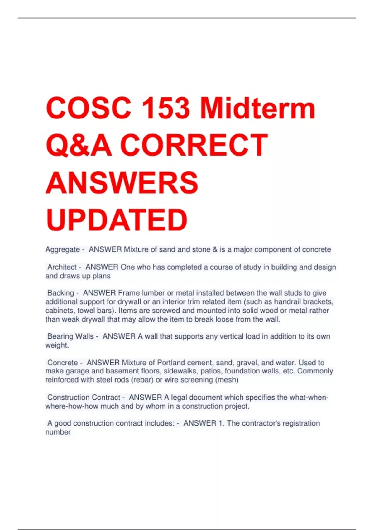 COSC 153 Midterm Q&A CORRECT ANSWERS UPDATED Aggregate - ANSWER Mixture of sand and stone & is a major component of concrete Architect - ANSWER One who has completed a course of study in building and design and draws up plans Backing - ANSWER Frame lumber or metal installed between the wall studs to give additional support for drywall or an interior trim related item (such as handrail brackets, cabinets, towel bars). Items are screwed and mounted into solid wood or metal rather than weak drywall that may allow the item to break loose from the wall. Bearing Walls - ANSWER A wall that supports any vertical load in addition to its own weight. Concrete - ANSWER Mixture of Portland cement, sand, gravel, and water. Used to make garage and basement floors, sidewalks, patios, foundation walls, etc. Commonly reinforced with steel rods (rebar) or wire screening (mesh) Construction Contract - ANSWER A legal document which specifies the what-whenwhere-how-how much and by whom in a construction project. A good construction contract includes: - ANSWER 1. The contractor's registration number 2. A statement of work quality such as 'Standard Practices of the Trades' or 'according to Manufacturers Specifications'. 3. A set of blue prints or plans 4. A construction timetable including starting and completion dates 5. A set of specifications 6. A fixed price for the work, or a time and materials formula 7. A payment schedule 8. Any allowances (budget for extra expenses) 9. A clause which outlines how any disputes will be resolved 10. A written warrantee Construction Drawings - ANSWER A complete set of construction drawings (drawn to scale) tends to comprise floor plans, elevations, sections and detail drawings, that together provide a complete representation of the building On many projects, each major trade on Construction Drawings will have separate trade drawings such as: - ANSWER - Architectural (including elevations, sections, details) - Structural (including foundations and superstructure, structure elevations, sections and details) - Electrical (including floor plans, elevations and details) - Plumbing (including floor plans, elevations and details) - Mechanical (including floor plans, elevations and details) - Fire Protection (including floor plans, elevations and details) - Roofing - Finishes - Etc... Drywall / Gypsum Wallboard (GWB) / Sheetrock / Plasterboard - ANSWER A manufactured panel made out of gypsum plaster and encased in a thin cardboard. Usually 1/2" thick and 4' x 8' or 4' x 12' in size. The panels are nailed or screwed onto the framing and the joints are taped and covered with 'joint compound'. Duct - ANSWER The AC / heating system. Usually round or rectangular metal pipes installed for distributing warm (or cold) air from the furnace or chilled system to rooms in the home. Also a tunnel made of galvanized metal or rigid fiberglass that carries air from the heater or ventilation opening to the rooms in a building. Estimate - ANSWER The amount of labor, materials, and other costs that a contractor anticipates for a project as summarized in the contractor's bid proposal for the project. Includes Materials & Labor, Overhead (charge a % for all the extra costs), and Profit. Footer / Footing - ANSWER Continuous (footing) or individual (footer) reinforced thick concrete pad installed underground which supports the foundation wall or column Foundation - ANSWER The supporting portion of a structure below the first floor construction, or below grade, including the footings (combination of everything) Grade - ANSWER Ground level, or the elevation at any given point. Also the work of leveling dirt. Also the designated quality of a manufactured piece of wood.