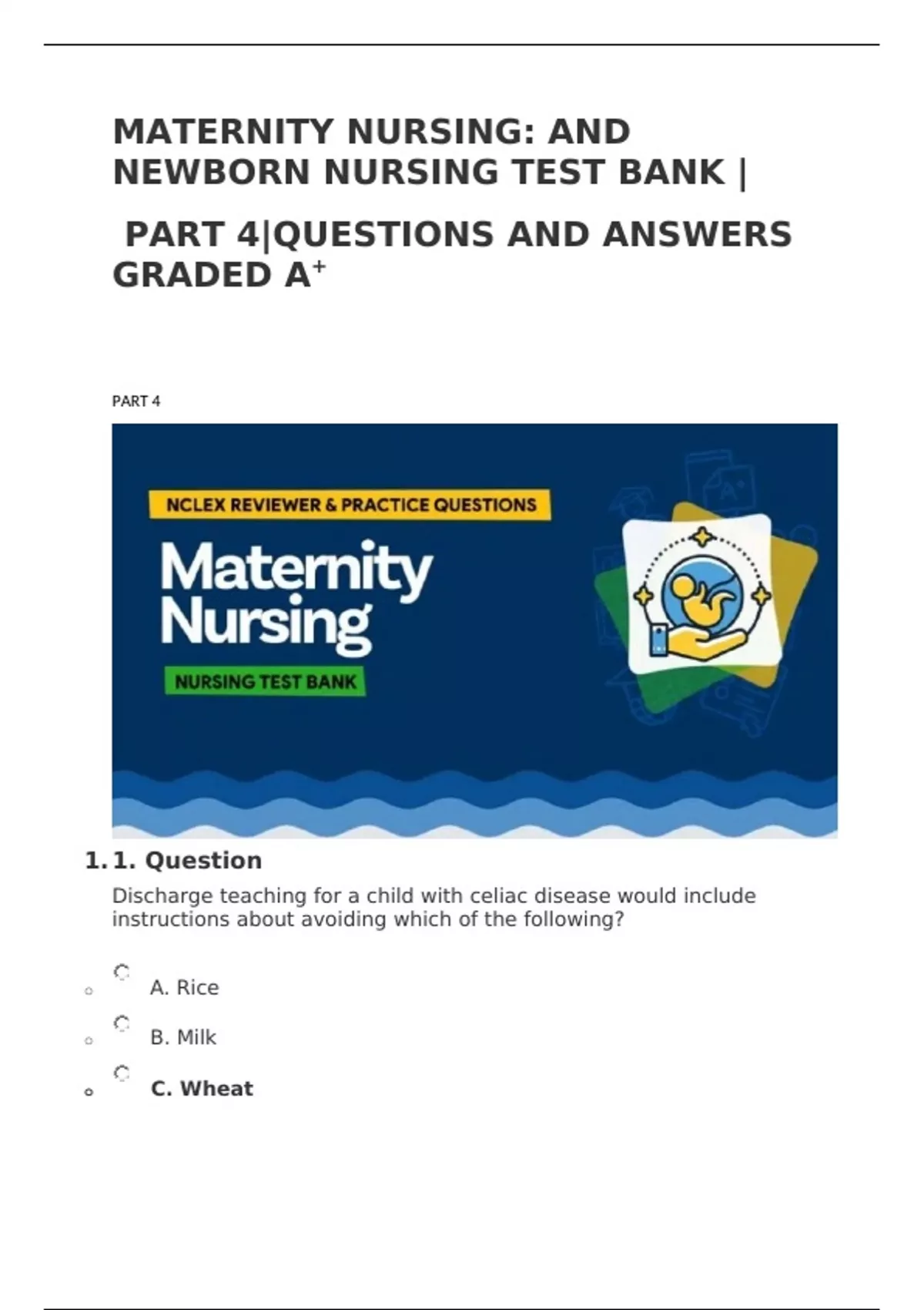 Discharge teaching for a child with celiac disease would include instructions about avoiding which of the following? o A. Rice o B. Milk o C. Wheat o D. Chicken Correct Correct Answer: C. Wheat Children with celiac disease cannot tolerate or digest gluten. Therefore, because of its gluten content, wheat and wheat-containing products must be avoided. • Option A: Rice is one of the most popular gluten-free grains for people with celiac disease. Many gluten-free packaged goods are made with rice instead of wheat. • Option B: It’s also important to note that while milk is gluten-free, for those newly diagnosed with celiac disease, secondary lactose intolerance is common due to the loss of lactase, an enzyme that digests milk sugar along the lining of the small intestine. • Option D: There are many naturally gluten-free foods to enjoy on the celiac disease diet, including: Animal proteins: Beef, chicken, dairy products, eggs, game meat, lamb, pork, seafood, and turkey