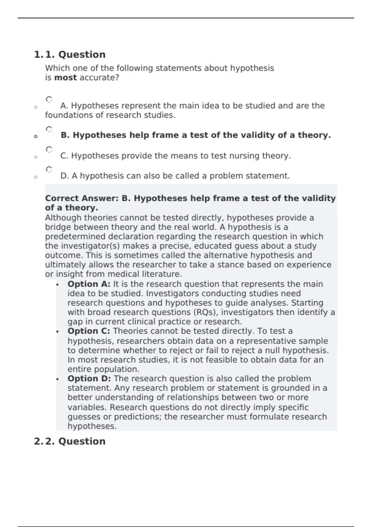 Which one of the following statements about hypothesis is most accurate? o A. Hypotheses represent the main idea to be studied and are the foundations of research studies. o B. Hypotheses help frame a test of the validity of a theory. o C. Hypotheses provide the means to test nursing theory. o D. A hypothesis can also be called a problem statement. Correct Answer: B. Hypotheses help frame a test of the validity of a theory. Although theories cannot be tested directly, hypotheses provide a bridge between theory and the real world. A hypothesis is a predetermined declaration regarding the research question in which the investigator(s) makes a precise, educated guess about a study outcome. This is sometimes called the alternative hypothesis and ultimately allows the researcher to take a stance based on experience or insight from medical literature. • Option A: It is the research question that represents the main idea to be studied. Investigators conducting studies need research questions and hypotheses to guide analyses. Starting with broad research questions (RQs), investigators then identify a gap in current clinical practice or research. • Option C: Theories cannot be tested directly. To test a hypothesis, researchers obtain data on a representative sample to determine whether to reject or fail to reject a null hypothesis. In most research studies, it is not feasible to obtain data for an entire population. • Option D: The research question is also called the problem statement. Any research problem or statement is grounded in a better understanding of relationships between two or more variables. Research questions do not directly imply specific guesses or predictions; the researcher must formulate research hypotheses.